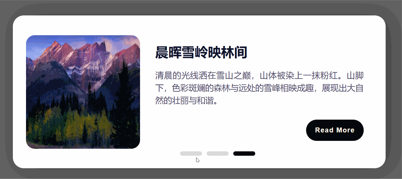这段HTML和CSS代码实现了一个具有动态滑动效果的卡片式图片展示页面,包含三个不同的图片和对应的内容描述。