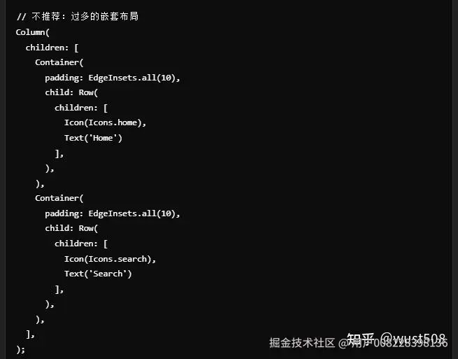 为了减少布局嵌套,开发者应尽量使用扁平化的布局结构,避免使用过多嵌套的布局容器。例如,使用Row、Column、Flex等容器代替复杂的Stack、Container等布局,从而减少不必要的嵌套层级。