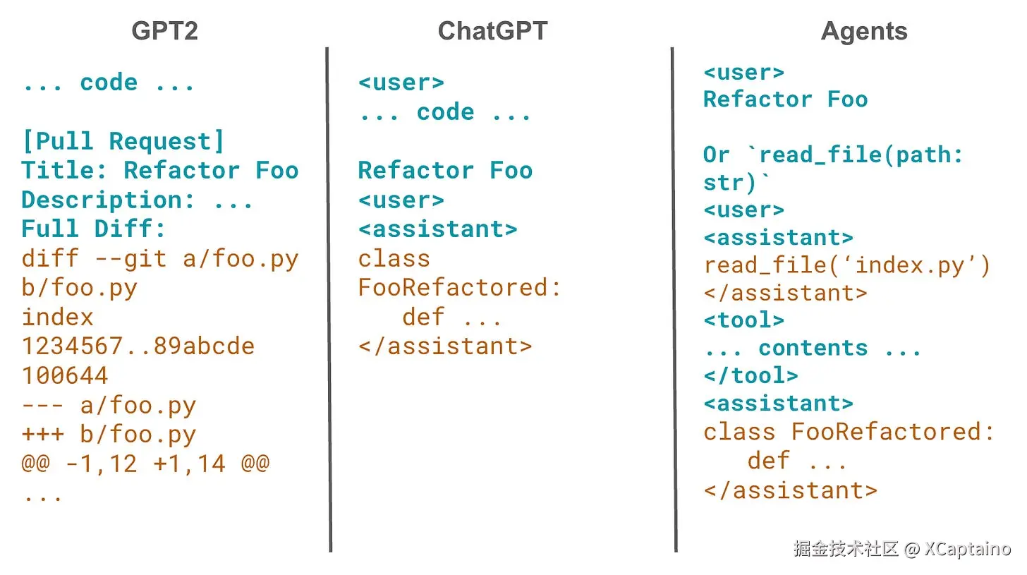 然后引入了指令调优 (例如,ChatGPT),使得LLMs 显著更加易于使用。你现在可以输入“写一个 PR 重构 Foo”,它会返回代码。幕后,这几乎完全是上述自动补全过程的同义词,但前缀变成了“ 写一个 PR 重构 Foo”,其中的LLM 现在在进行对话。即使在今天,你也会看到一些奇怪的情况,其中这个事实会泄露出来,LLM 会通过继续自动补全超过“”标记来自问自答。
