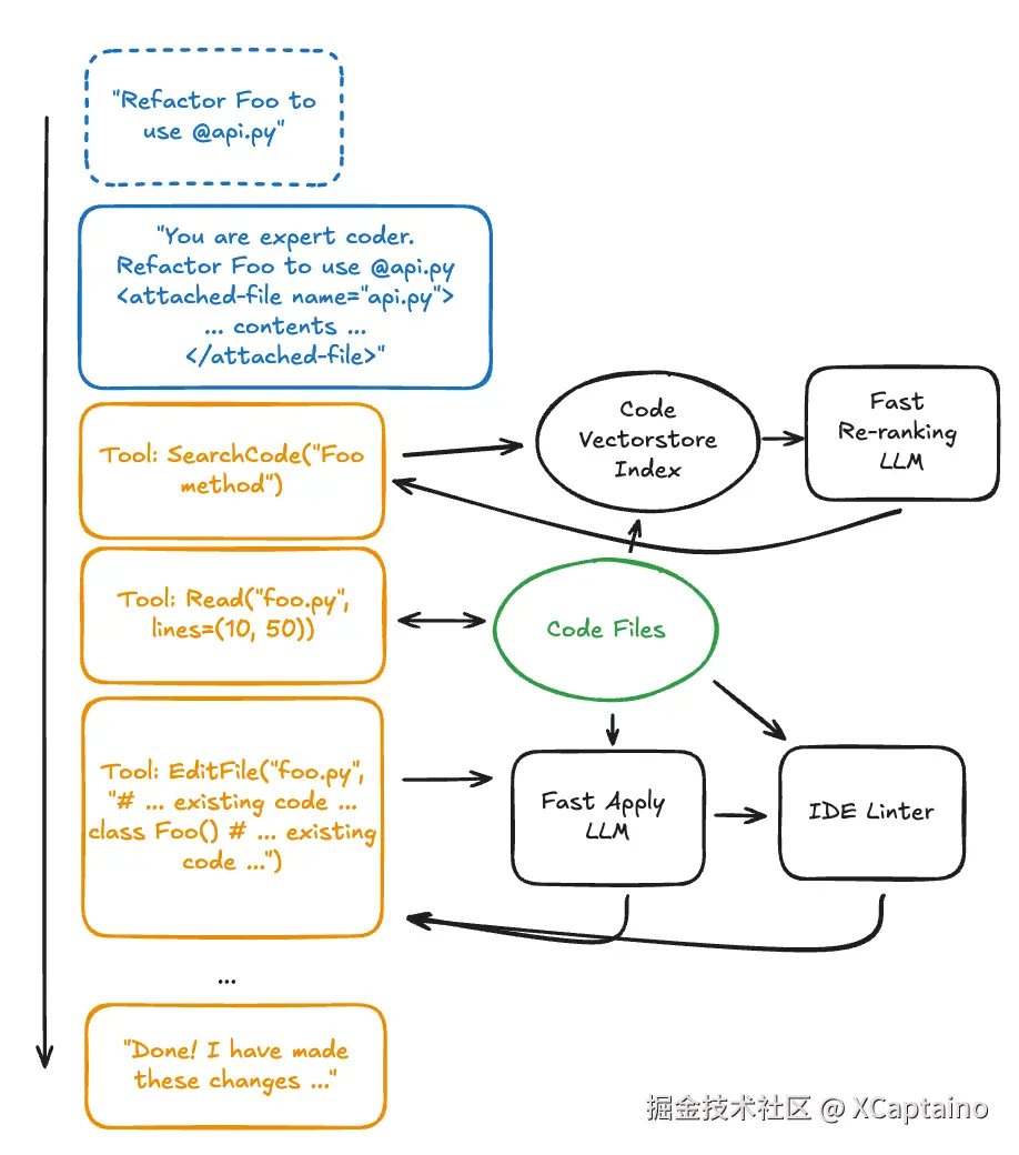 这是当你使用 AI IDE 时幕后发生的情况的图表。我们简化了主要代理的工具,并将“认知负担”转移到其他LLMs上。IDE 将你的@-标签注入上下文,调用多个工具来收集更多上下文,用特殊的差异语法编辑文件,然后返回给用户一个总结响应。