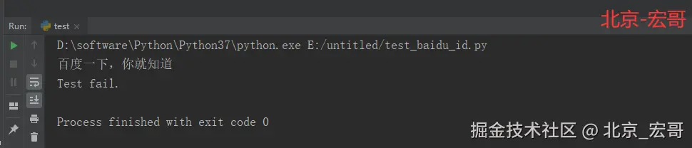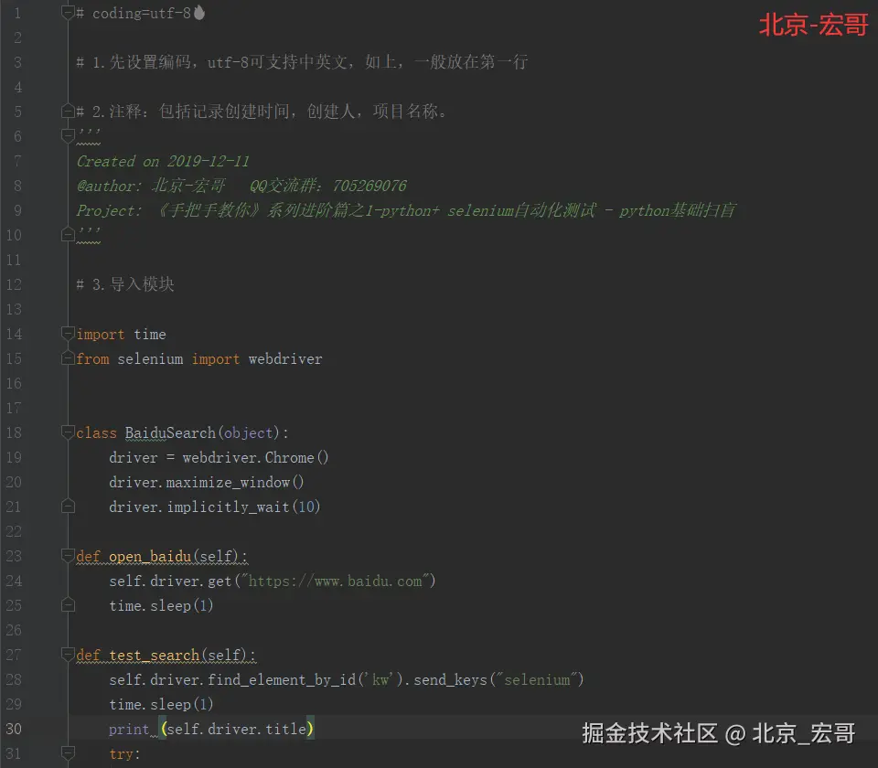 这里宏哥以下用百度搜索举例,模仿上面用类调用实例的方法来写这个脚本,可能看起来比较啰嗦,但是代码多了,你就会体会到类的作用,注意这里self指的是当前BaiduSearch这个类本身:
