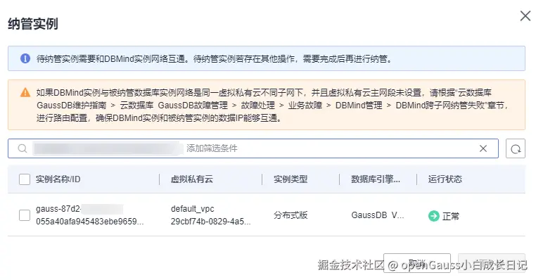 勾选需要纳管的GaussDB数据库实例,单击“下一步”。