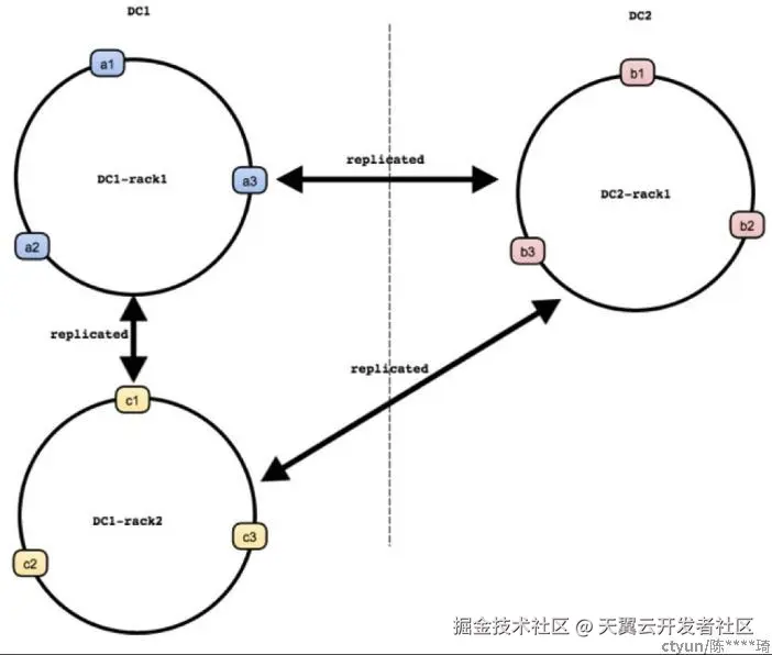上面是官方给的两个拓扑图,其结构和elasticsearch集群的结构比较相似。 这个图里面有两个概念,datacent和rack。这两个概念举例来理解,假设我们在阿里云有集群,在腾讯云也有集群,这就叫两个datacent,或者换种说法,假设有很多集群,这些集群可以根据物理机所在位置或者其他标准,分成了两大部分,这就叫两个datacent。 然后在每个datacent内,可能某些物理机在一个机房或者机架甚至就是一个机器上的几个虚拟机,那么这些机器之间的通信等速度肯定会更快,这些机器可以组成一个集群,就叫一个rack。