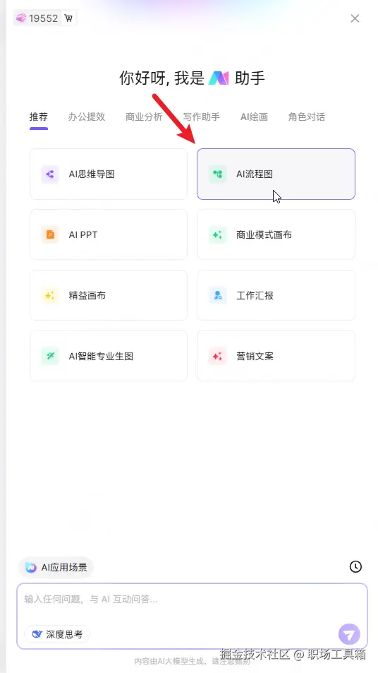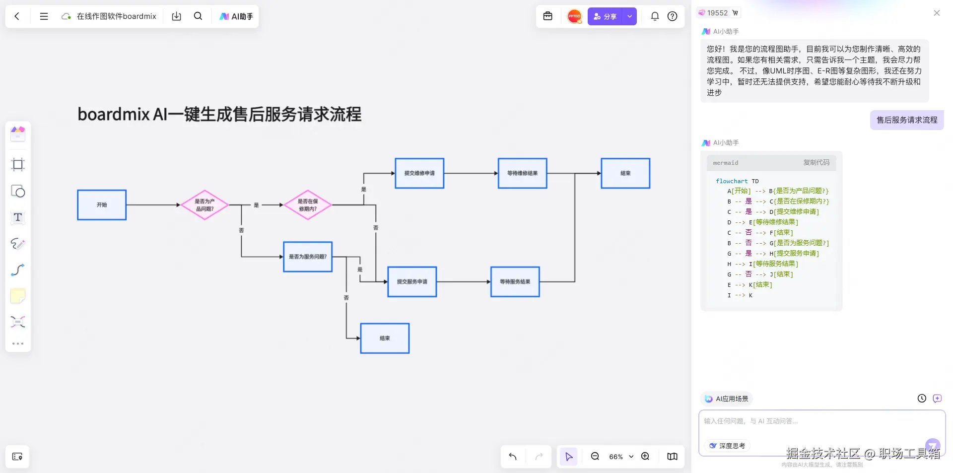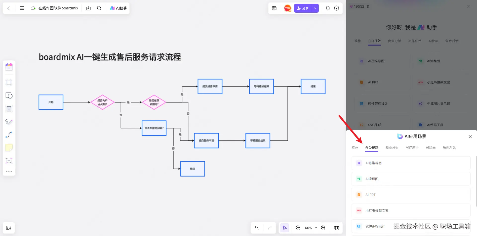 譬如我们想在线制作一个售后服务流程图,可以点击boardmix画布左上角的“AI助手”,打开右侧的AI智能体面板,点击AI智能体“AI流程图”,启动AI生成流程图的智能体。