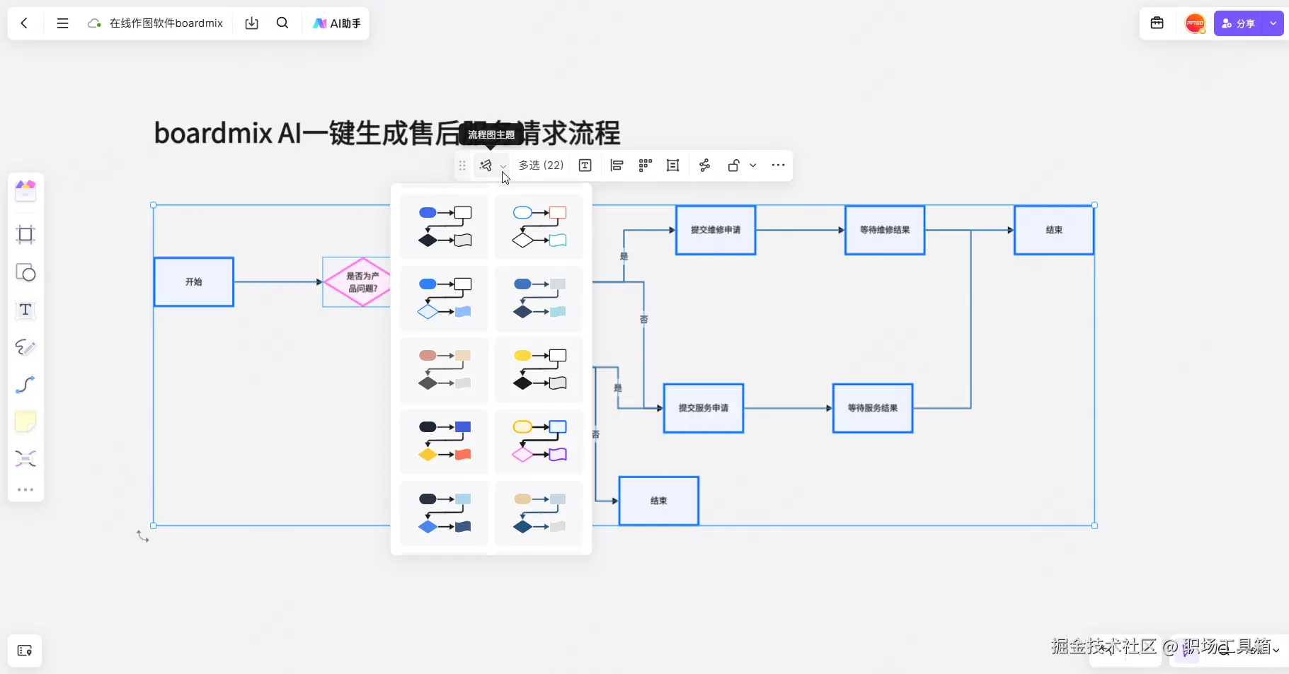 boardmix AI智能体生成的流程图,外观默认为单色样式,如果想更换为彩色样式,可先用鼠标框选整个流程图,点击“流程图主题”选项,在弹出的浮窗,一键更改流程图等可视化图形的颜色样式。