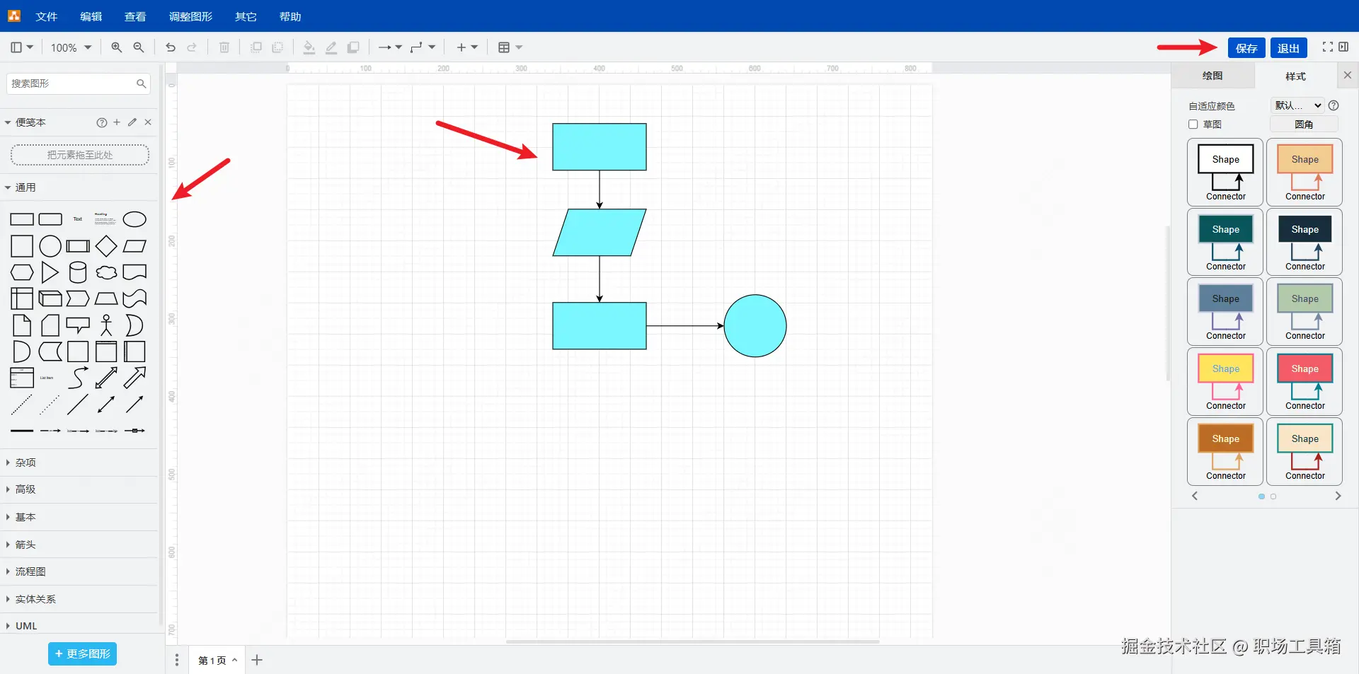 呈现在面前的,就是熟悉的drawio绘图界面,左侧是drawio内置的各种图形,拖拽到中间的画布,即可在线作图,完成后点击右上角的“保存”按钮,会以drawio文件的形式嵌入boardmix画布。