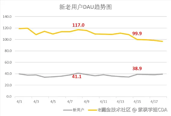 分析一款游戏 APP 的 DAU 时,发现新用户的 DAU 在注册后的前几天较高,而老用户的 DAU 相对稳定,那么就可以针对新用户和老用户制定不同的运营策略。
