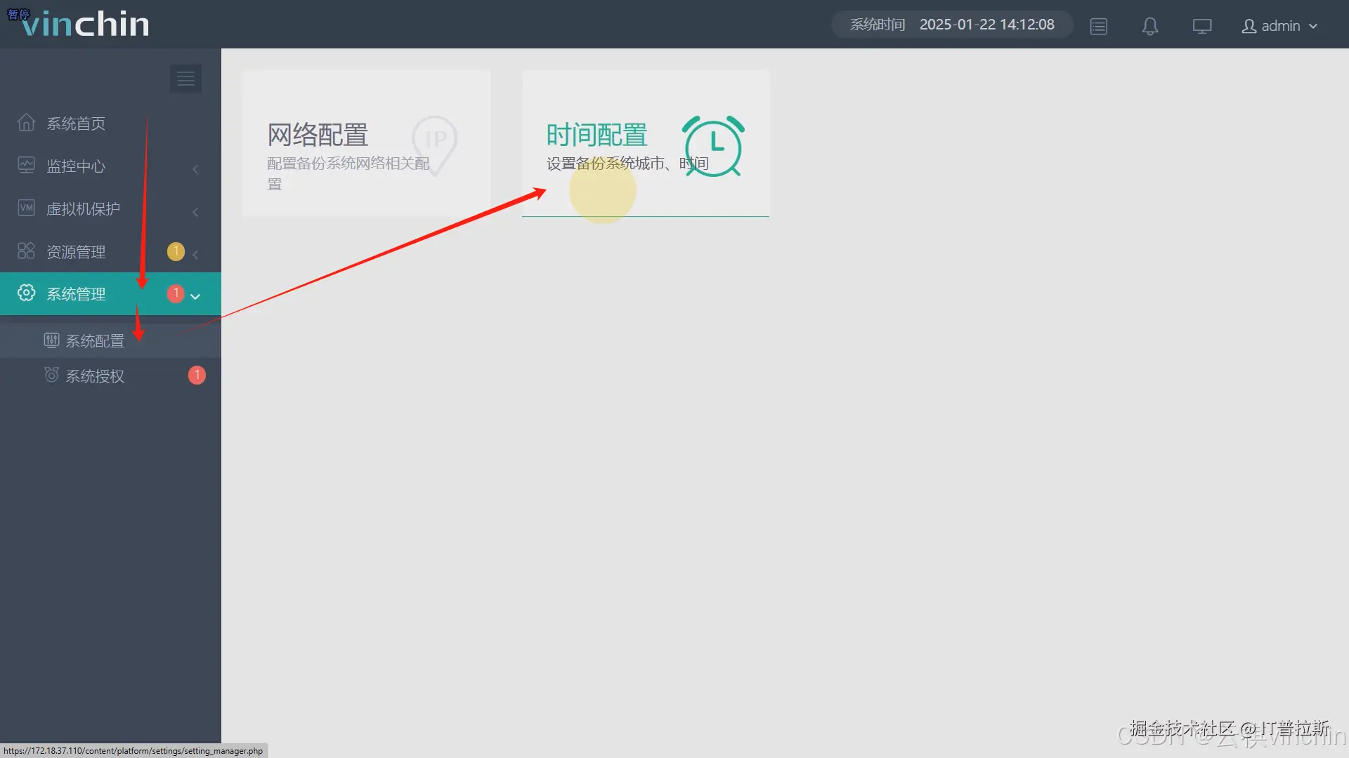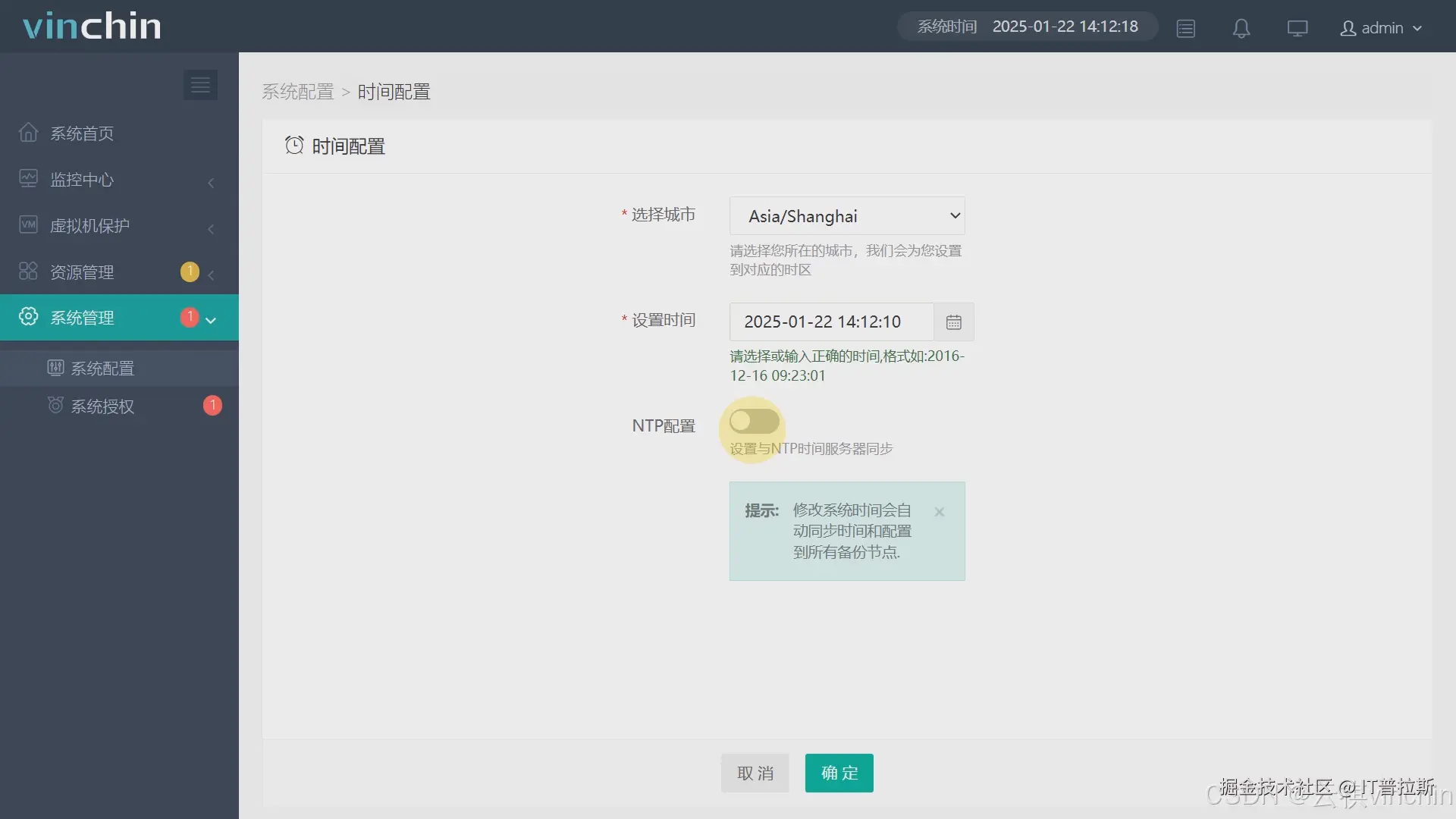 访问并登录容灾备份系统,依次点击【系统管理】【系统配置】【时间配置】,支持手动修改时间或NTP自动同步当前时间,修改完成后点击【提交】时间配置完成,如图1与图2。