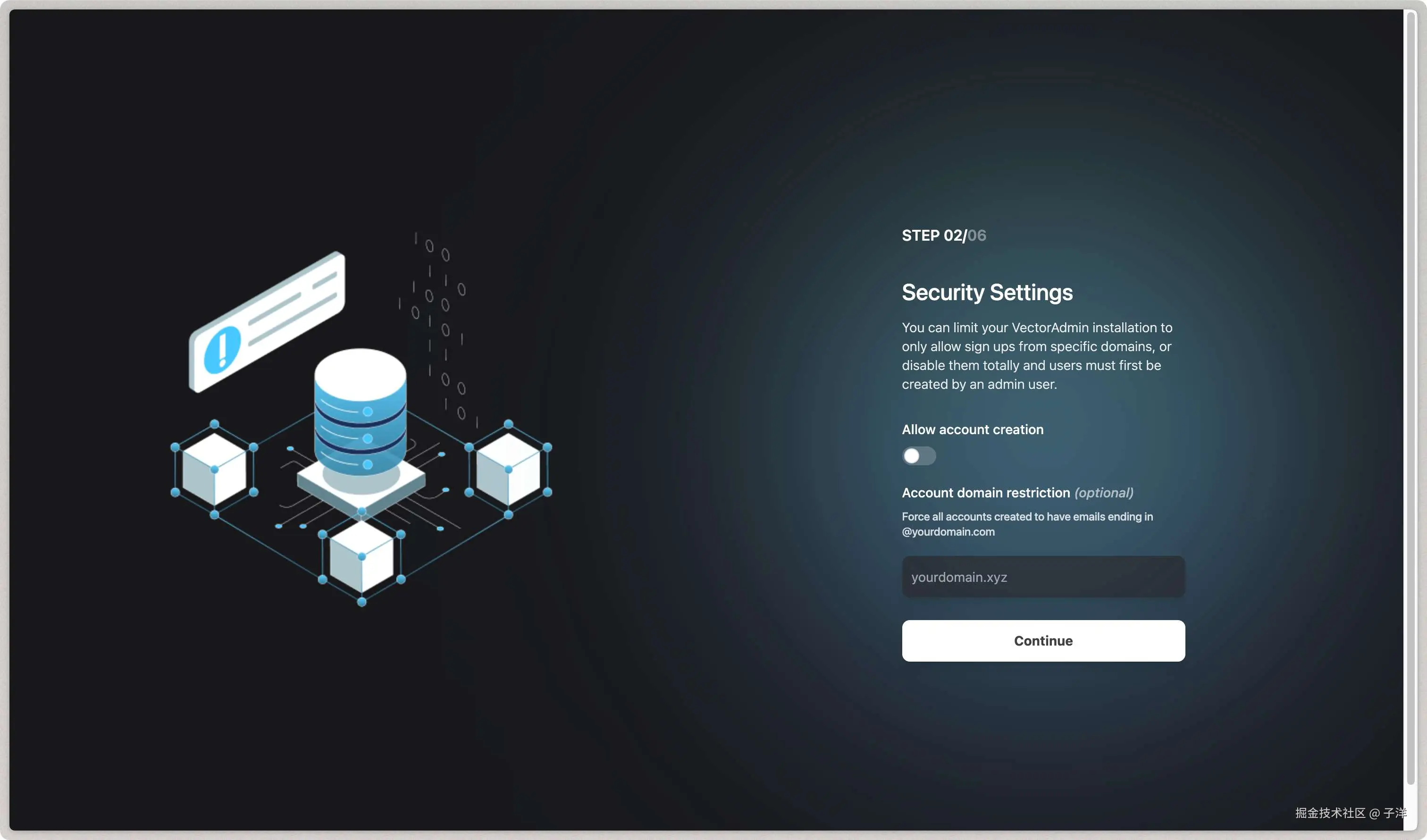 为了进一步保障系统安全,你还可以进行一些安全设置。例如,你可以将 VectorAdmin 安装限制为只允许来自特定域的注册,或者直接完全禁用外部注册功能,确保所有用户都必须先由管理员用户手动创建,从而更好地控制用户来源和权限。