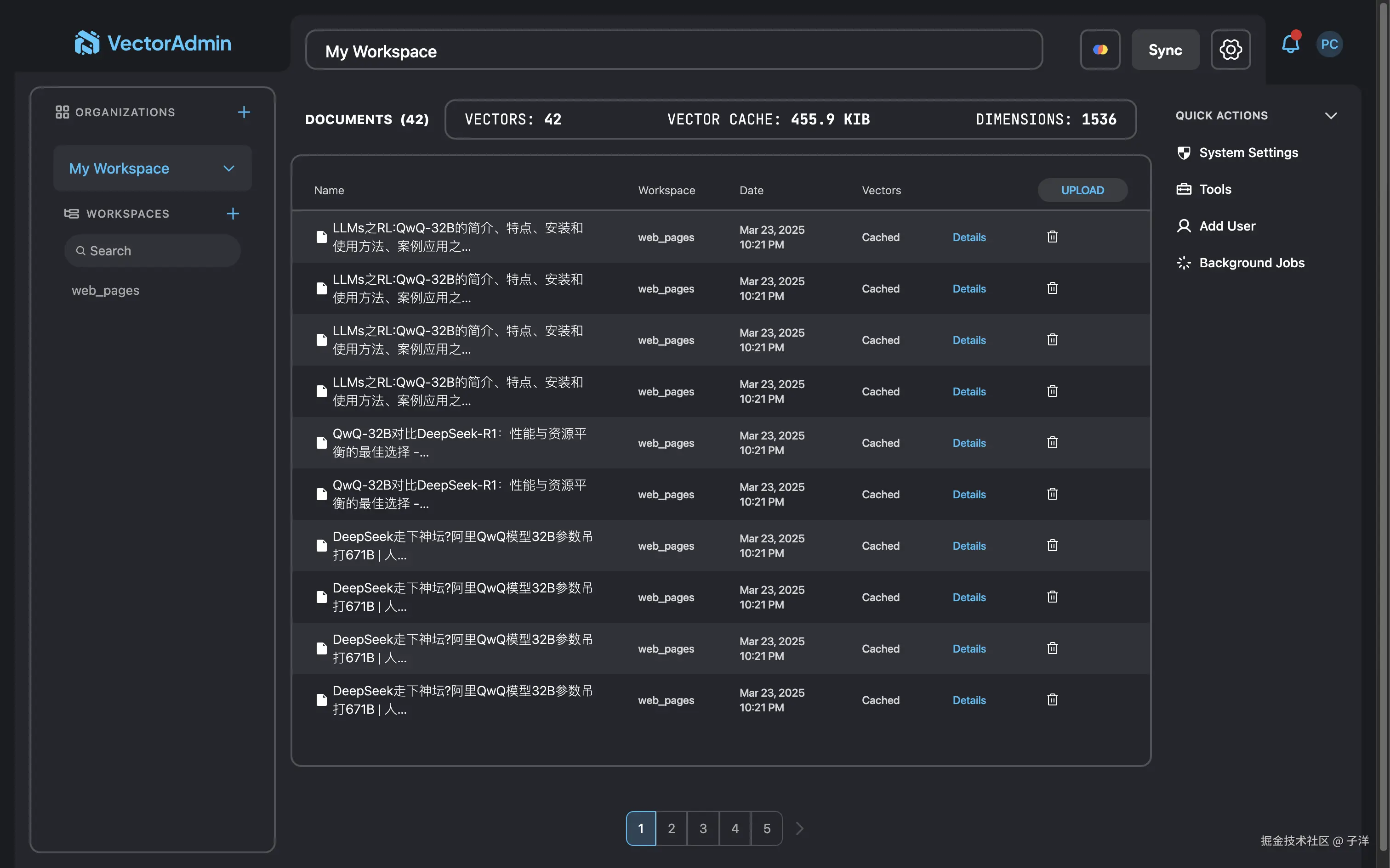 登录后,你将正式进入管理界面。界面的左侧呈现 组织列表,每个组织都与一个向量数据库的链接相对应,而每个组织下面又可以创建多个 工作空间,每个工作空间代表一个单独的 Collection / Schema。中间的主要部分是数据的浏览和管理区域,在这里,当你选中一个工作空间后,可以对其中的数据执行搜索、上传、删除等各种操作,使你能够灵活地处理和管理数据。最右侧是快速操作的列表,通过这个列表,你可以方便地对 VectorAdmin 进行各种管理操作,例如用户管理、系统设置等。