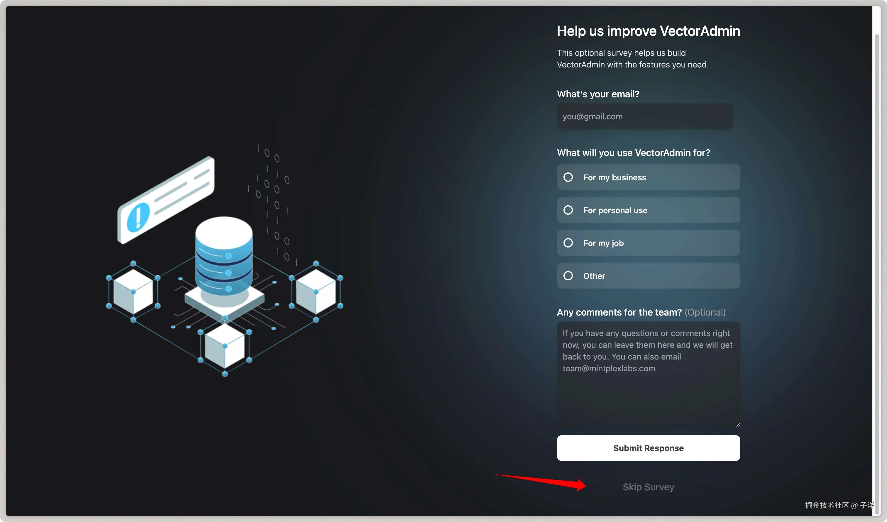 在这个阶段,你会看到帮助 Vector Admin 改进建议的页面。这里的每一条建议都有可能帮助我们优化产品,提升用户体验。当然,如果你不想参与反馈,直接点击底部的 Skip Suvey 即可进入下一步。