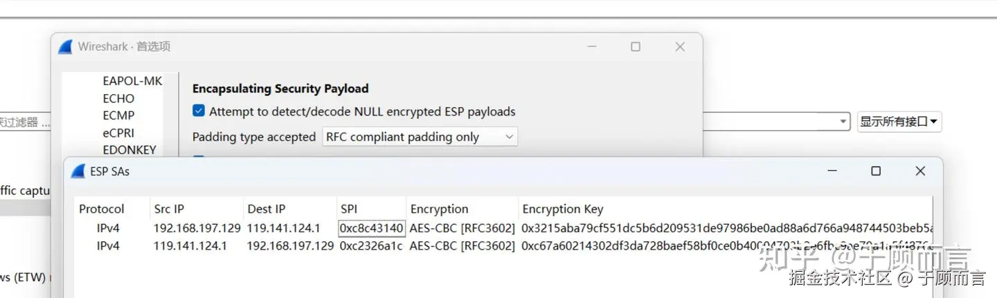 这边,我将详细介绍方案二的方法,该方案的优势在于无需修改代码或额外组件,通过日志中的KEYING MATERIAL字段即可提取出ESP会话密钥(包括加密/认证密钥、SPI等),配合Wireshark的"协议首选项->ESP->导入密钥"功能,即可实现跨平台的数据包解密分析。