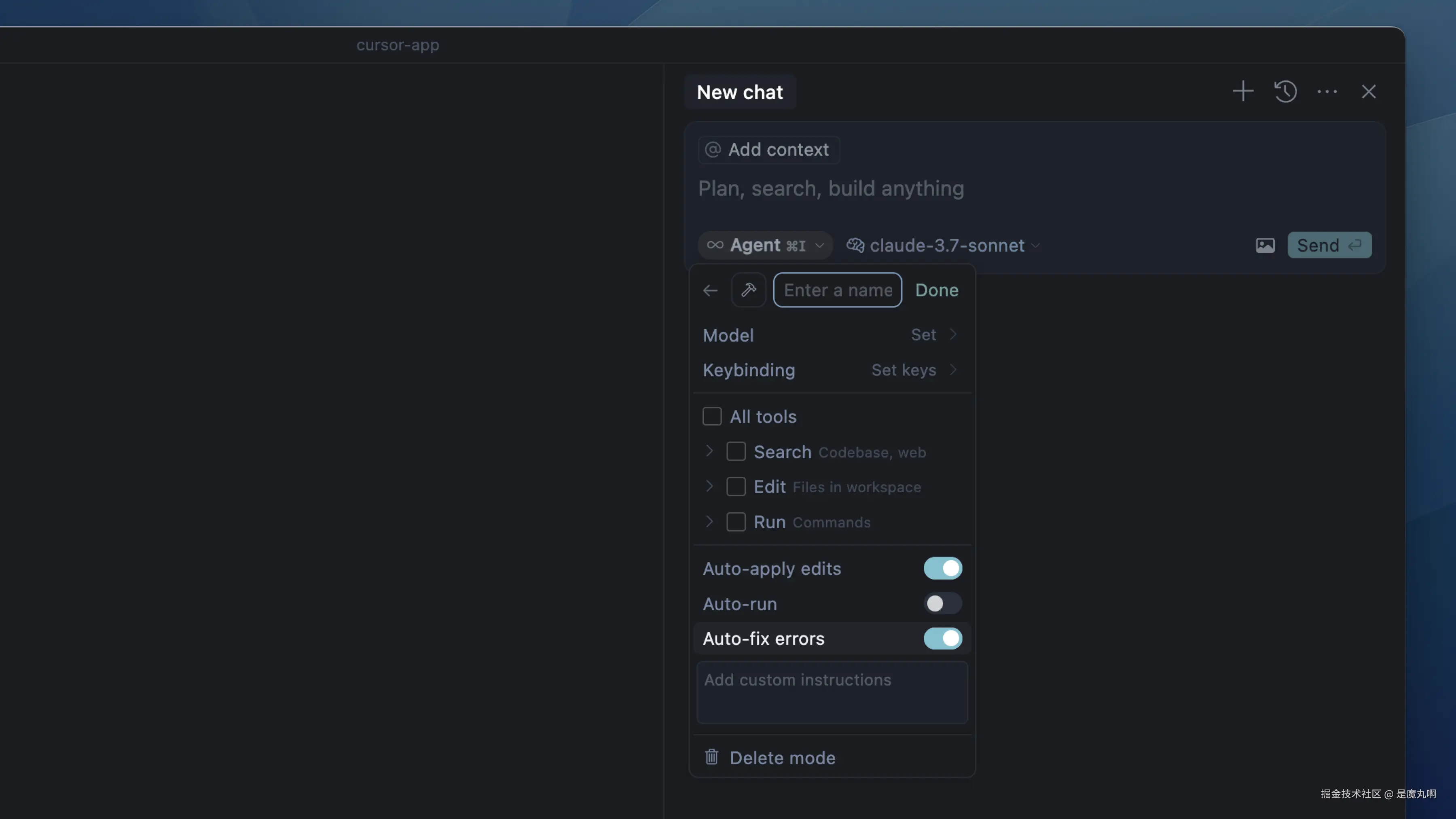 自定义模式(测试版)允许您组合新的模式,配备适合您工作流程的工具和提示。由于自定义模式可以有自定义键绑定,⌘I默认为Agent模式,⌘L将切换侧边栏。如果您解除⌘I的绑定,它也会切换侧边栏。自定义模式目前处于测试阶段,您可以从设置→功能→聊天→自定义模式中启用它们。 您还可以从设置(设置→功能→聊天→默认聊天模式)中设置默认模式为您的某个模式或最近使用的模式。 阅读更多关于自定义模式的信息。
