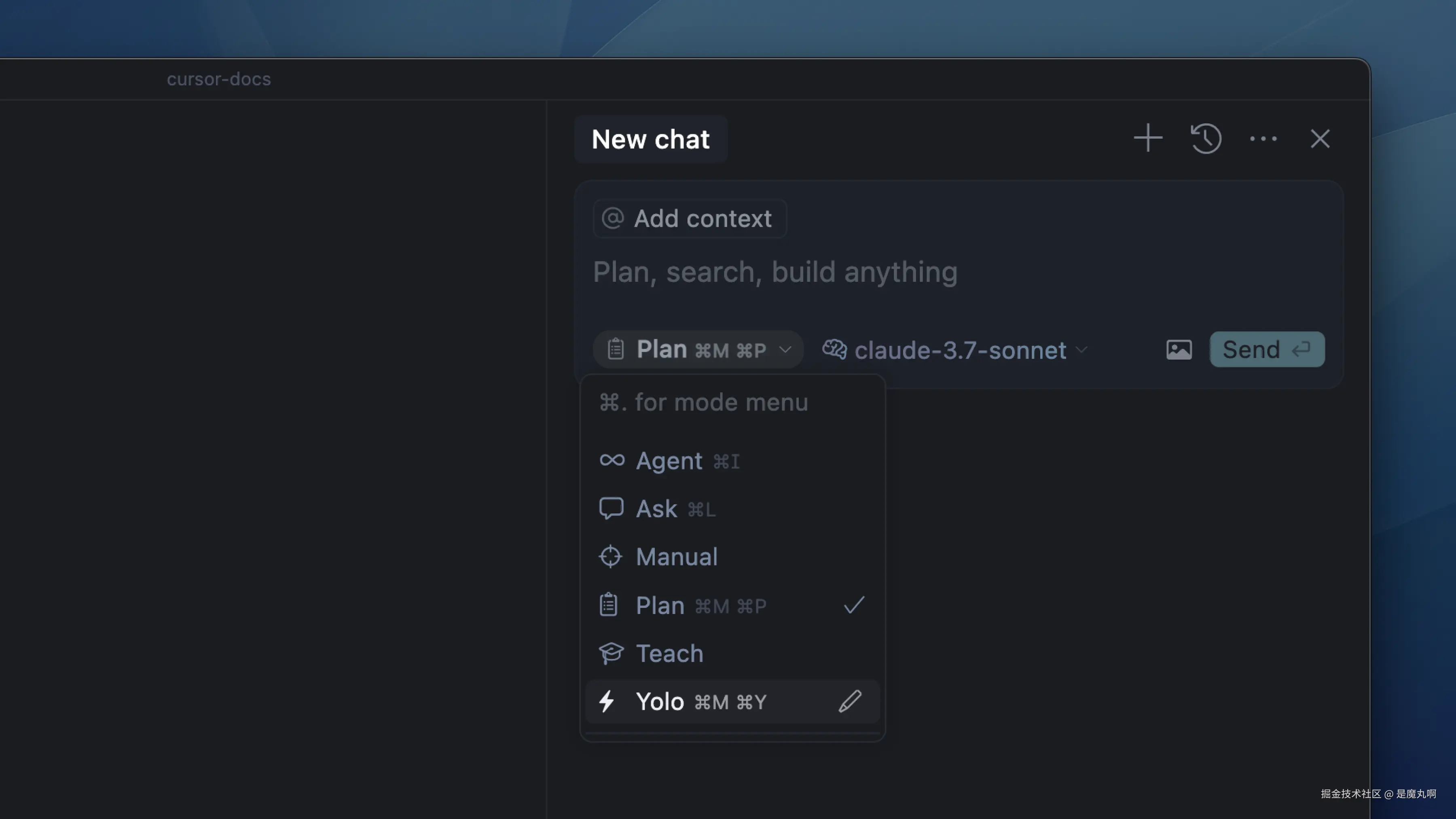 Agent模式和Ask模式是Cursor中的内置模式,现在还可以添加自定义模式。我们还将"Edit"重命名为"Manual",以更好地反映其行为。 Ask模式现在默认可以访问所有搜索工具,因此@Codebase工具已被移除。它会在需要时自动搜索代码库,如果您想强制搜索,只需用自然语言要求Cursor"搜索代码库"。您可以从模式菜单中禁用Ask的搜索功能。这将导致Ask模式只看到您提供的上下文。 您可以阅读更多关于Agent和Ask的信息。
