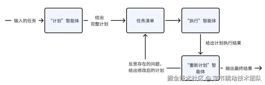 解决的思路,首先是把单个的 LLM 节点拆分成两个,一个负责 “计划”,一个负责 “执行”: