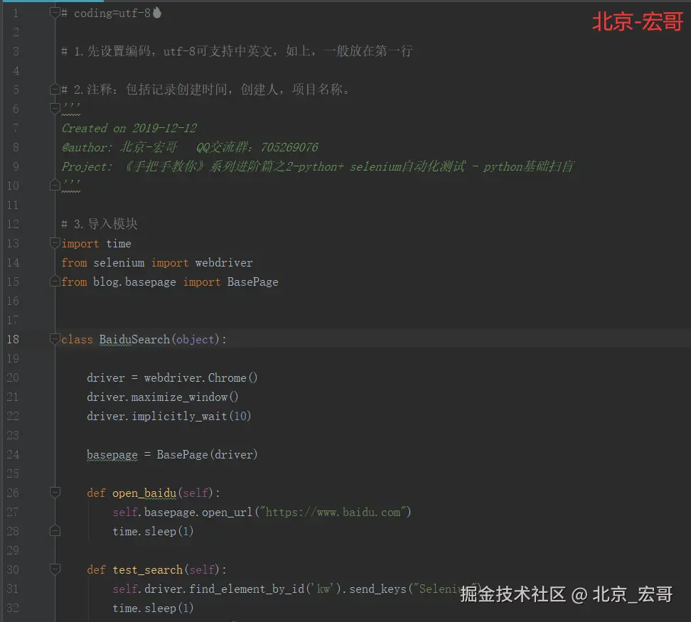 上图,baidu_search.py是我们编写测试脚本的python文件,具体测试代码写在这个文件。包test1下的basepage.py文件是这次我们介绍的二次封装selenium方法而新建的。这里提一下,python中默认规则,包名和文件名都是小写,类名称单词首字母大写,函数名称小写,多个字母下划线隔开。我们尽量遵守下这个不成文的约定。