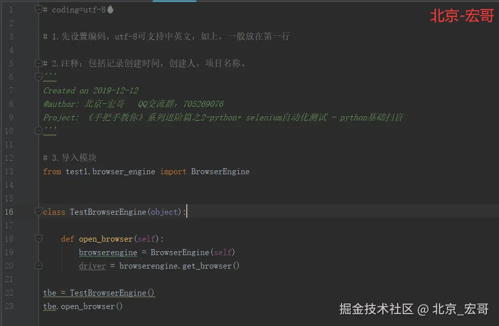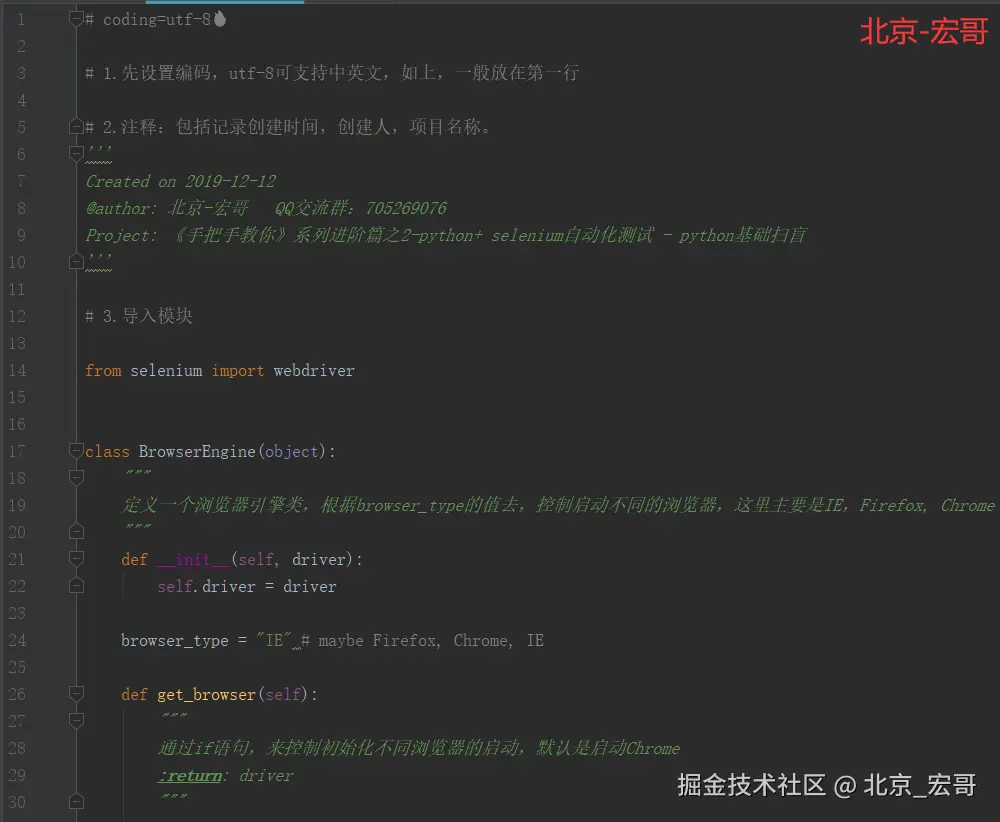目前,自定义的浏览器引擎类到这里就封装好了,只支持打开不同浏览器,需要手动修改,引擎类中browser_type的值。看起来功能简单,但是我们只是需要学习这种做事的方式和思维,在下一个部分,框架设计的时候,我会再告诉大家如何去加强这个引擎类