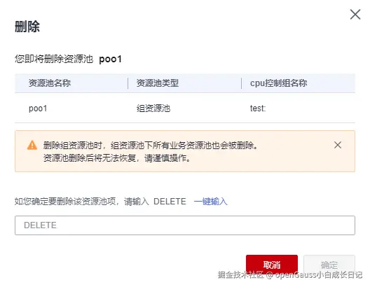 弹框中输入“DELETE”或单击“一键输入”,删除指定的组资源池或业务资源池。
