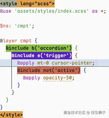 项目代码结合使用了 sass 函数和 tailwind 的 @apply 指令,如下图示。