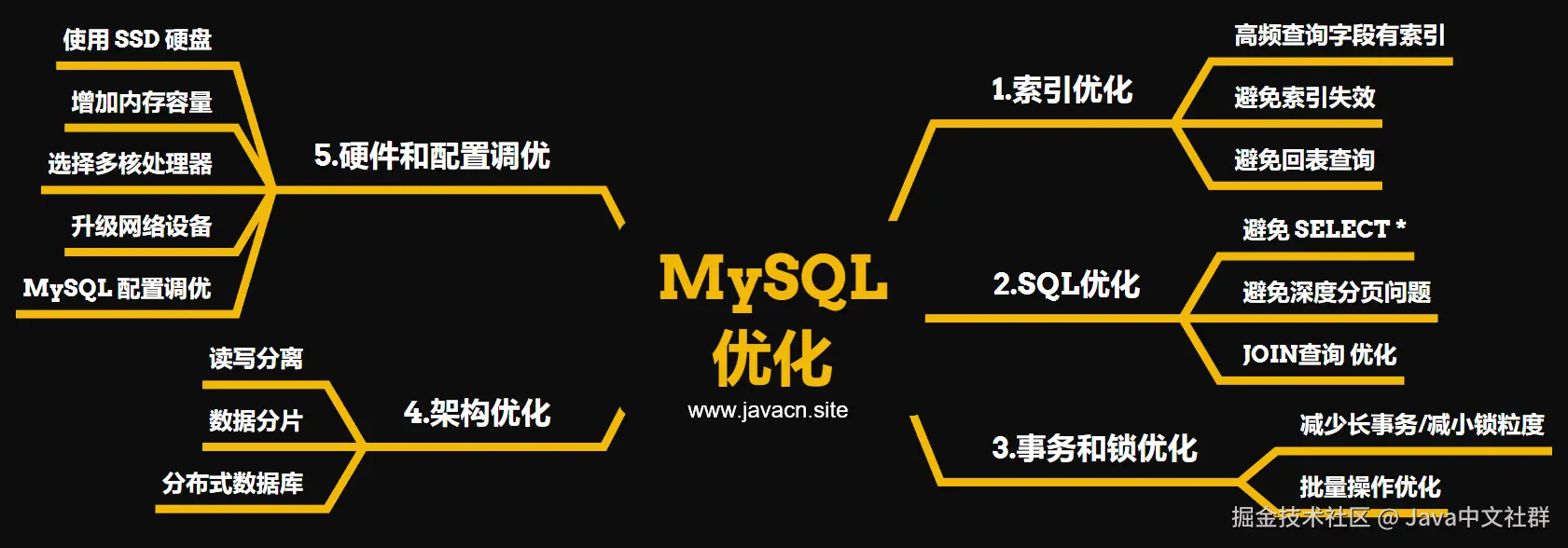 工作中常见的 MySQL 优化手段分为以下五大类: