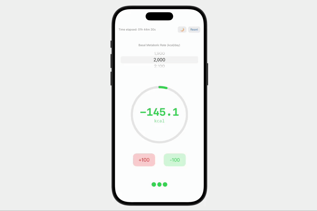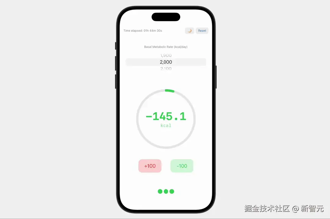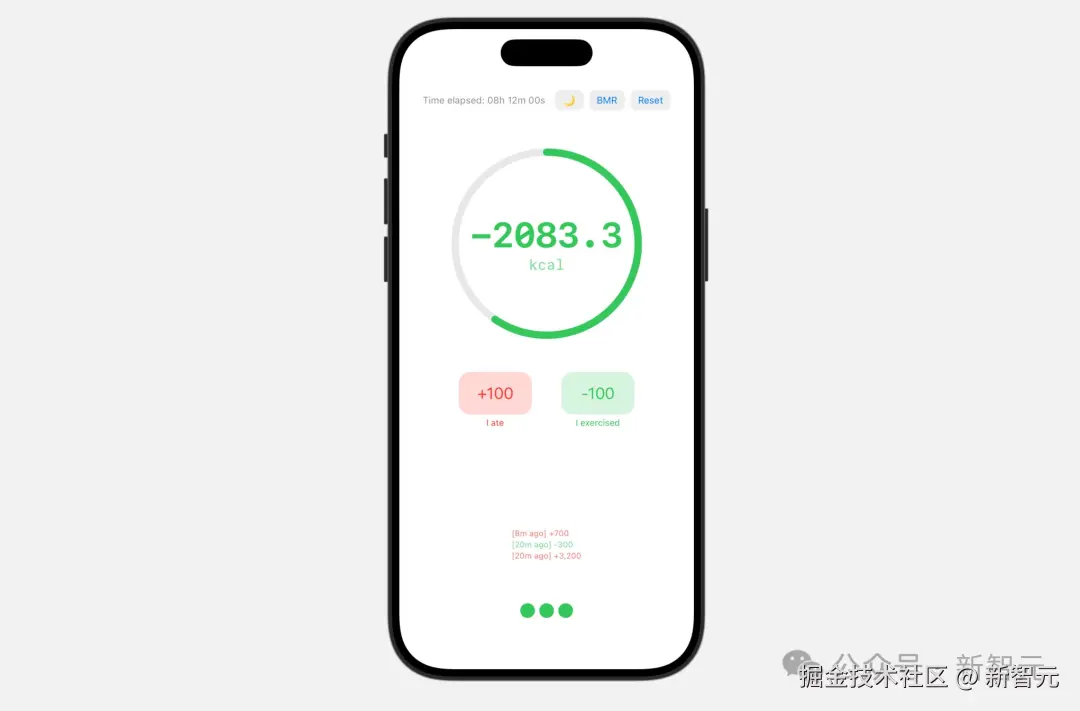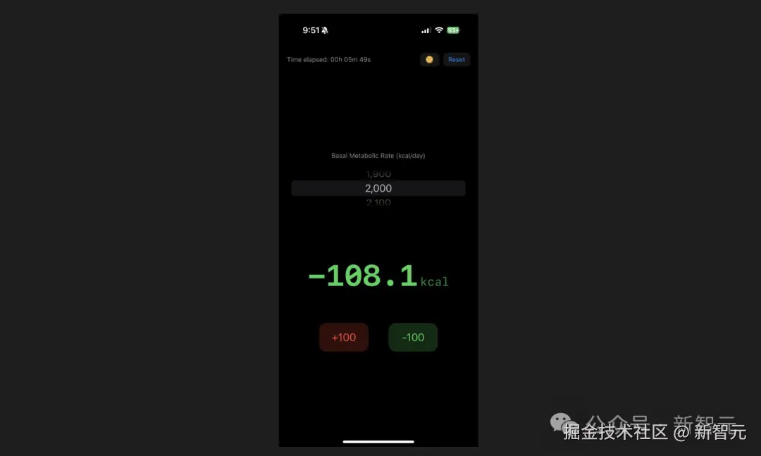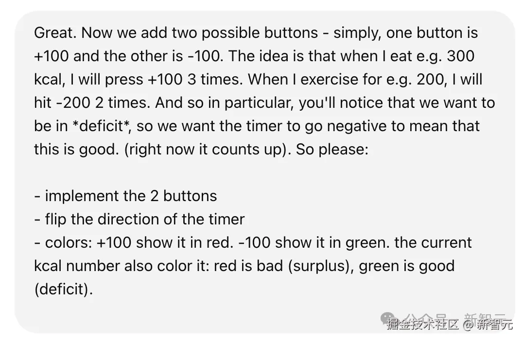 Karpathy 就像一位产品经理一样,给出了自己的具体要求:「计时器」主要体现随时间变化而自然消耗的热量,用大号数字显示在屏幕中央,还要每秒更新一次消耗的热量。