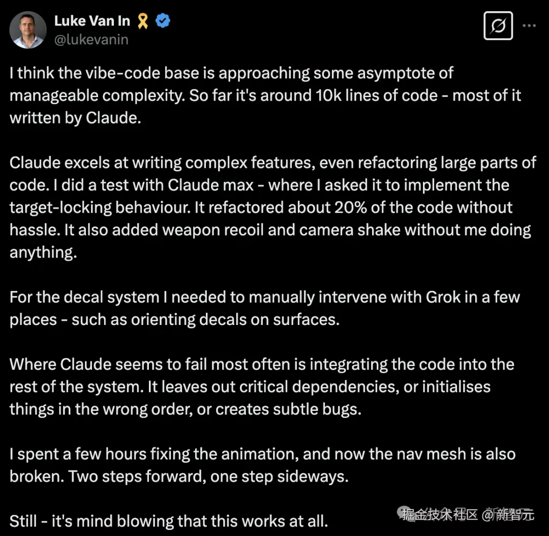 他认为,当前代码库的复杂库已经接近可控的极限,Claude 已经能够重构 20% 代码,并自动添加了武器后坐力和镜头抖动的效果。