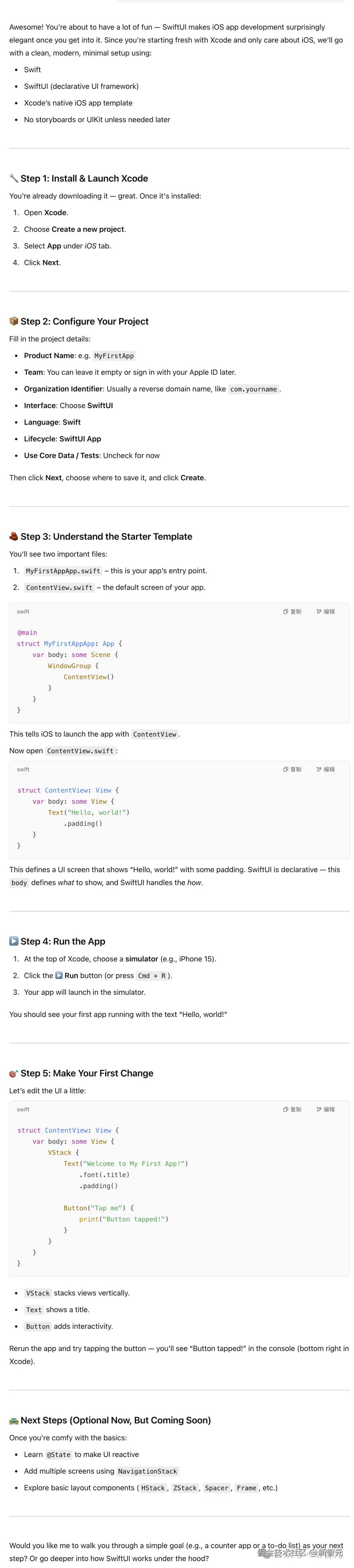 在启动应用阶段,Karpathy 从 0 开始,告诉 ChatGPT 自己的需求:刚刚下载了 Xcode,希望用 SwiftUI 构建一个 iOS 应用。
