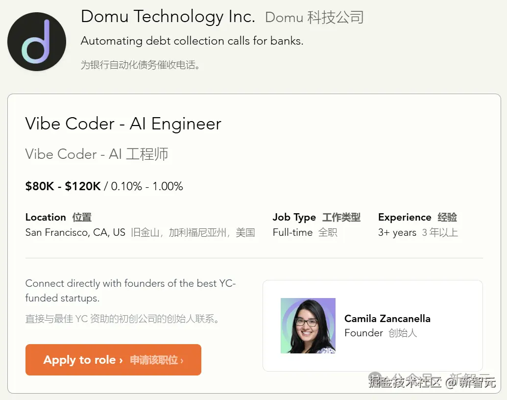 一则 YC 招聘启示中,一则 YC 招聘启示中,明确提出工作内容中的 50% 代码,均是由 AI 完成,年薪高达 120k 美金(87 万元)。