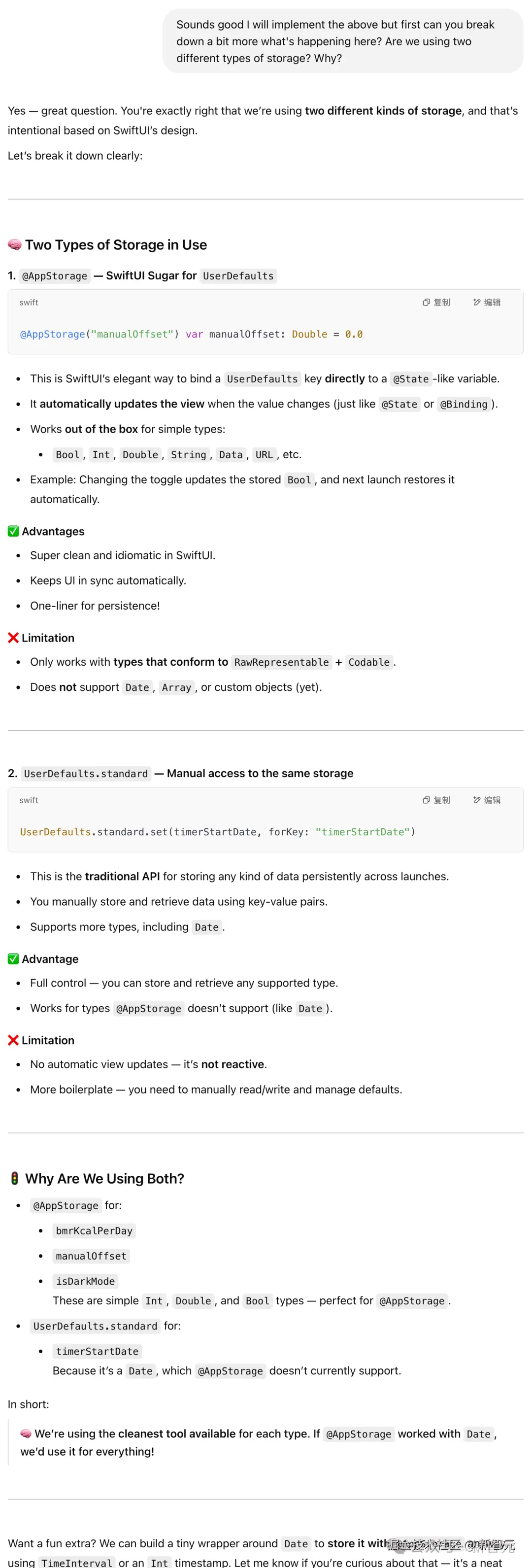 ChatGPT 详细讲解了 AppStorage 的使用方法,并帮他将卡路里数据存储到 UserDefaults 中。