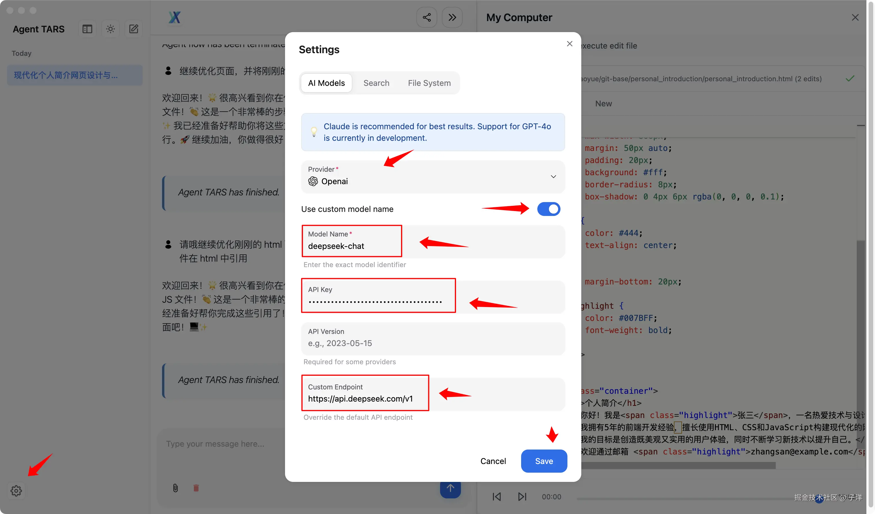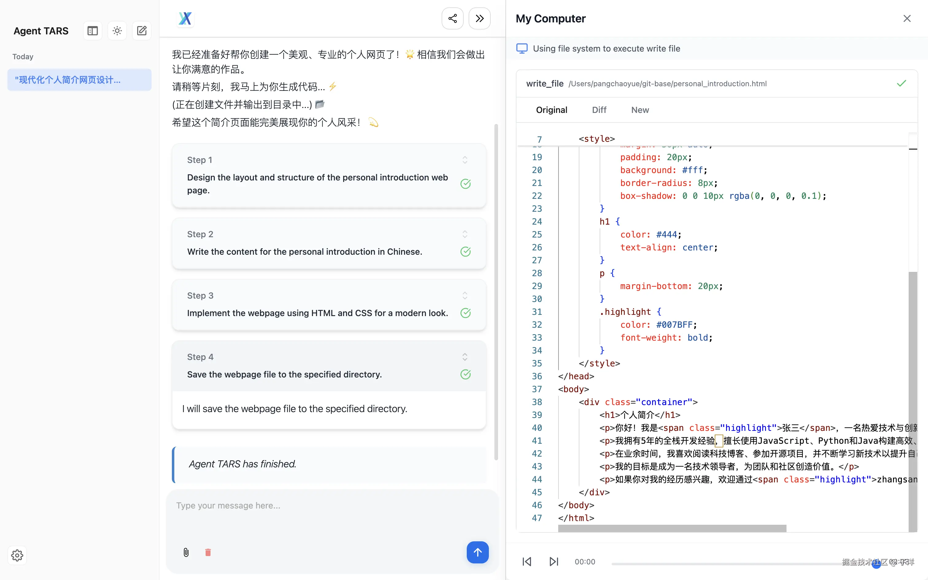安装并配置完成后,我们可以让 Agent TARS 执行一些任务,以下是一个生成个人介绍的示例