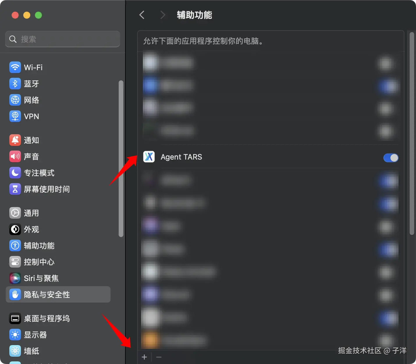 由于 Agent TARS 需要模拟用户操作,因此需要系统权限,按照以下步骤开启 辅助功能权限:
