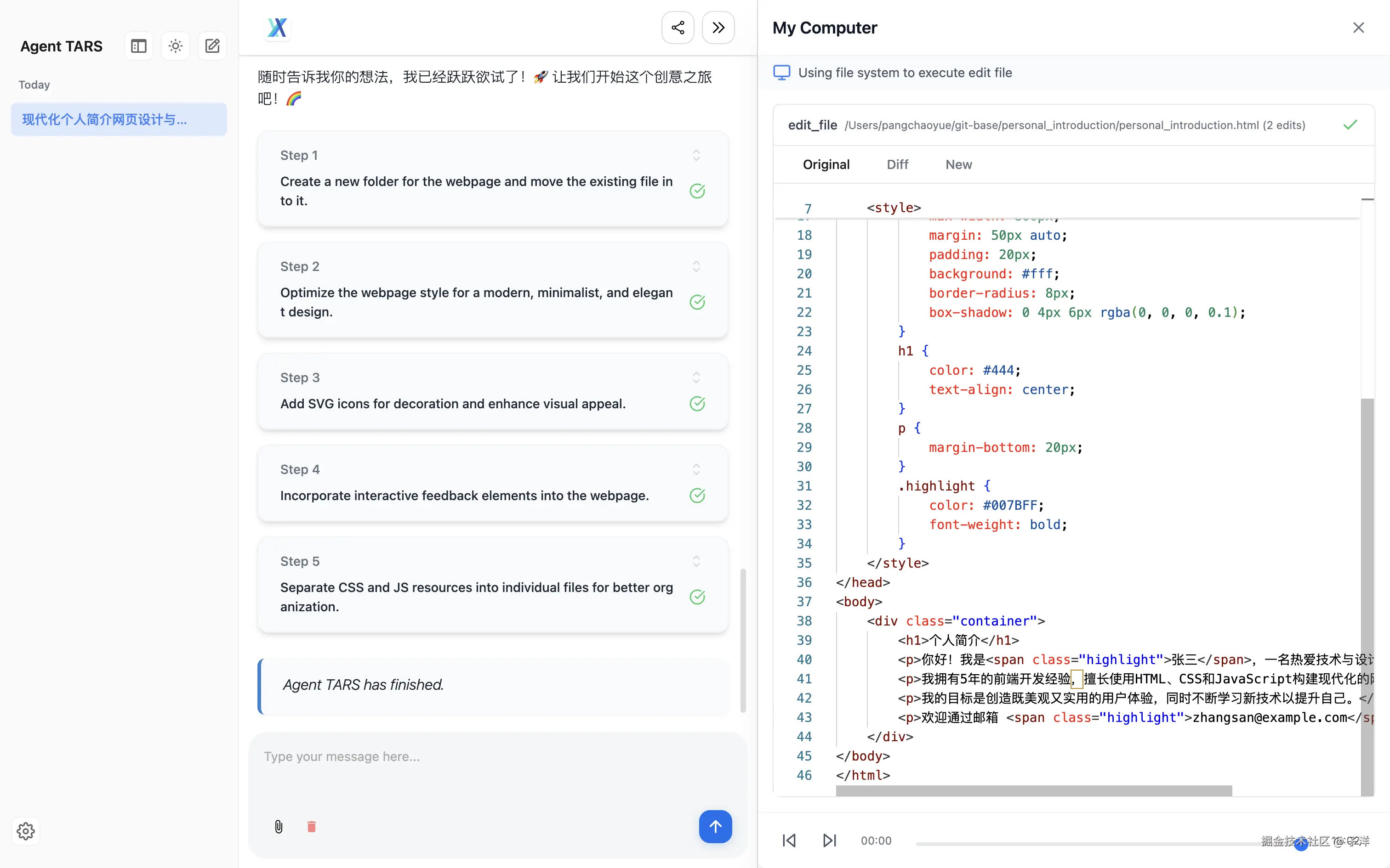 我让 Agent TARS 生成一个现代化的个人简介网页,并保存到本地: