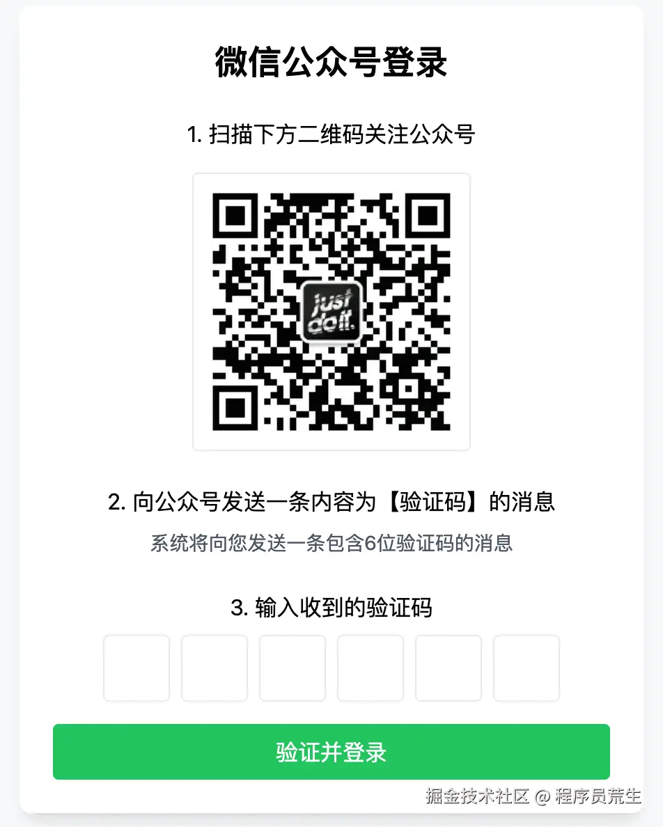 以下是一个基于 Next.js 开发的微信公众号登录验证系统,通过公众号菜单触发生成验证码,用户在网页端输入验证码完成登录认证。