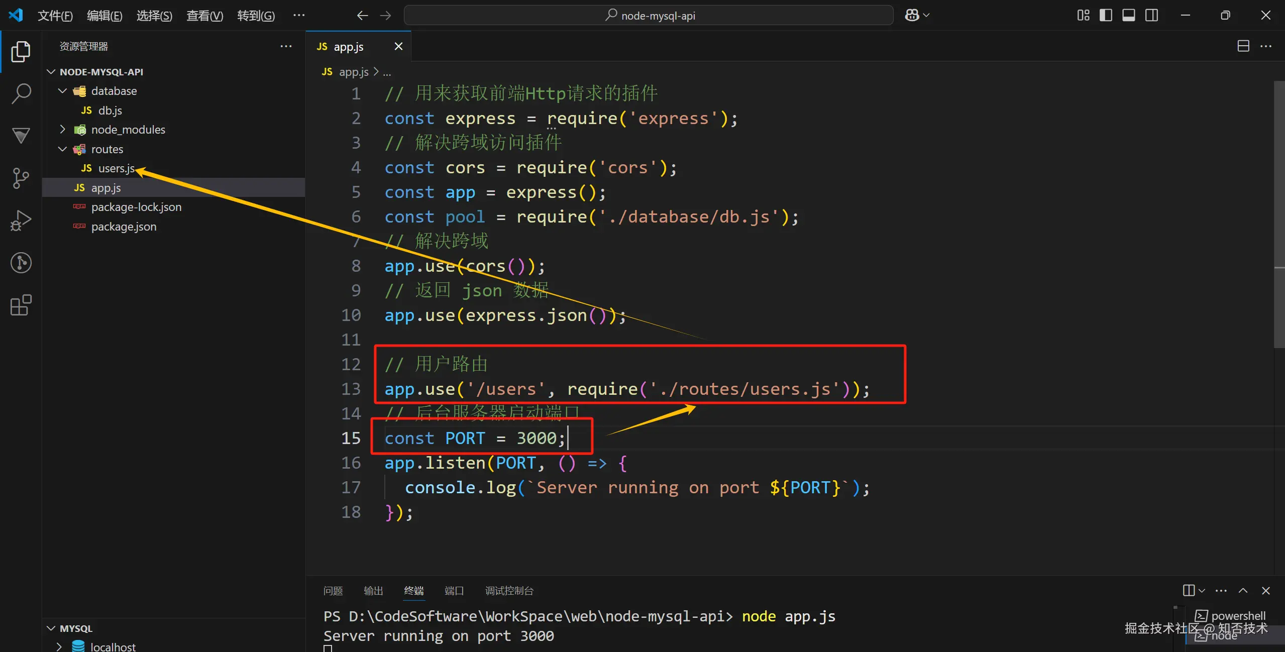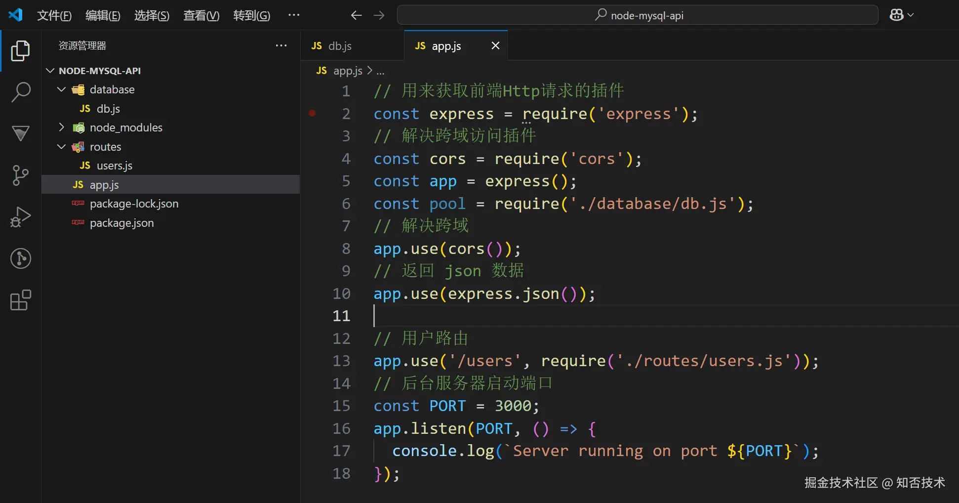 我们在地址栏输入 http://localhost:3000/users/ 向后台发起请求,node 后端服务根据浏览器路径 /users 匹配到了 routes 下的users.js 接口文件。