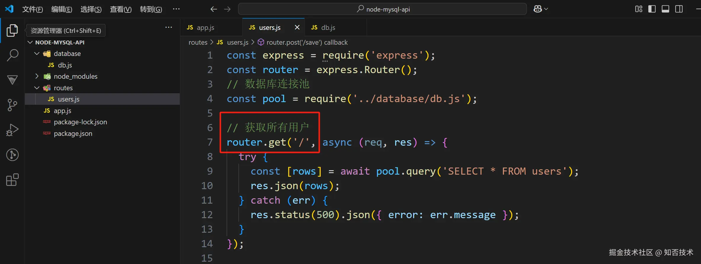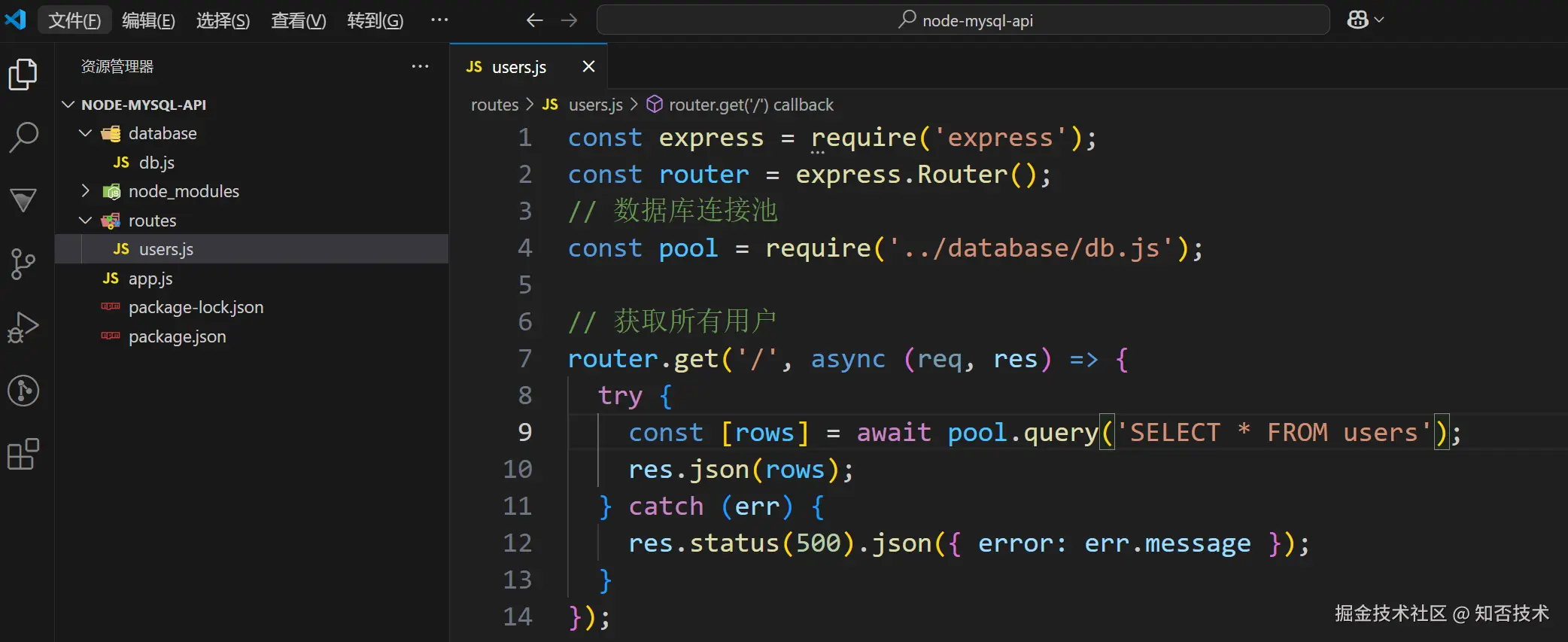 users.js 文件根据后面的 / 匹配查询方法,在查询方法里面通过执行 sql 语句获取数据,并将数据以 json 格式返回到前端浏览器。