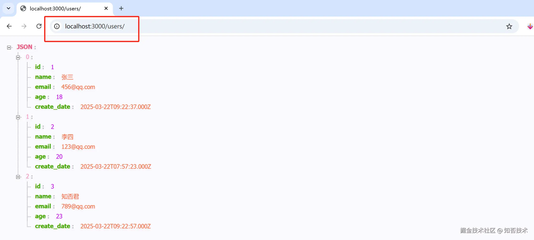 在浏览器输入接口地址,获取所有用户信息: