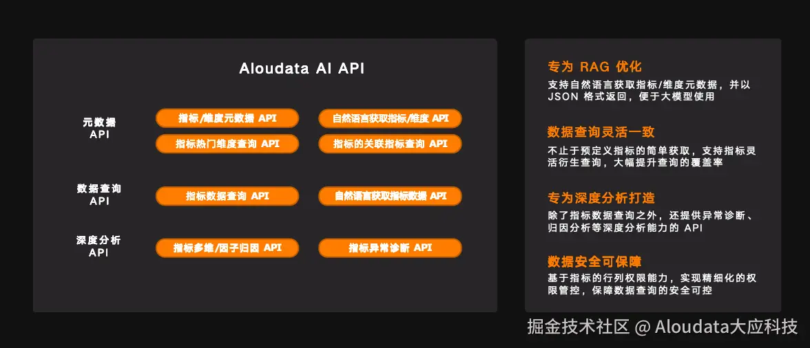此外,Aloudata 还发布了专为 RAG(Retrieval-Augmented Generation)优化的 Aloudata AI API,可为企业提供元数据 API(包括指标/维度元数据 API、自然语言获取指标/维度 API、指标热门维度查询 API、指标的关联指标查询 API)、数据查询 API(包括指标数据查询 API、自然语言获取指标数据 API)、深度分析 API(包括指标多维/因子归因 API、指标异常诊断 API),极大便捷企业 AI 大模型用数需求,进一步加速 AI 应用创新。