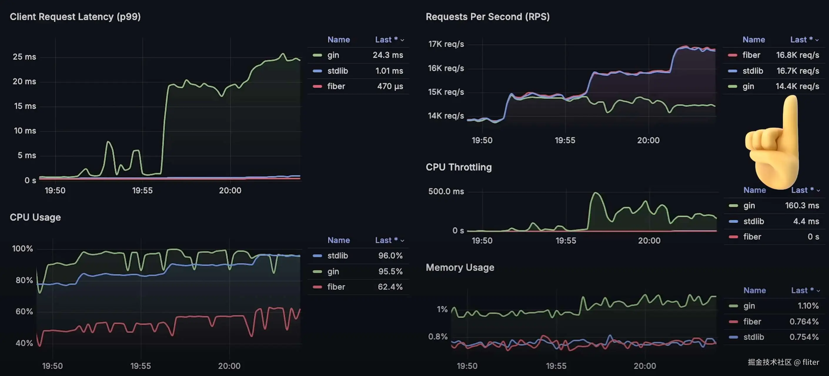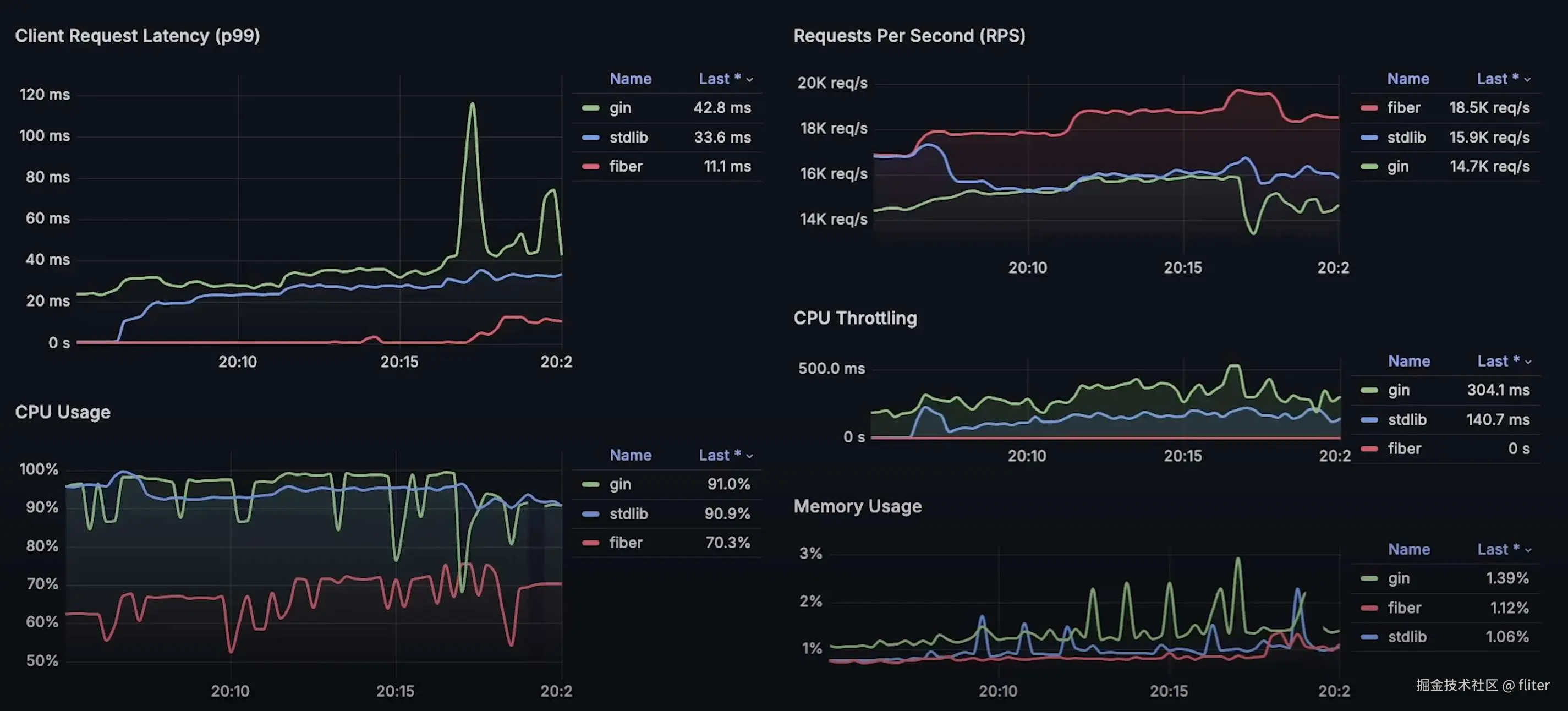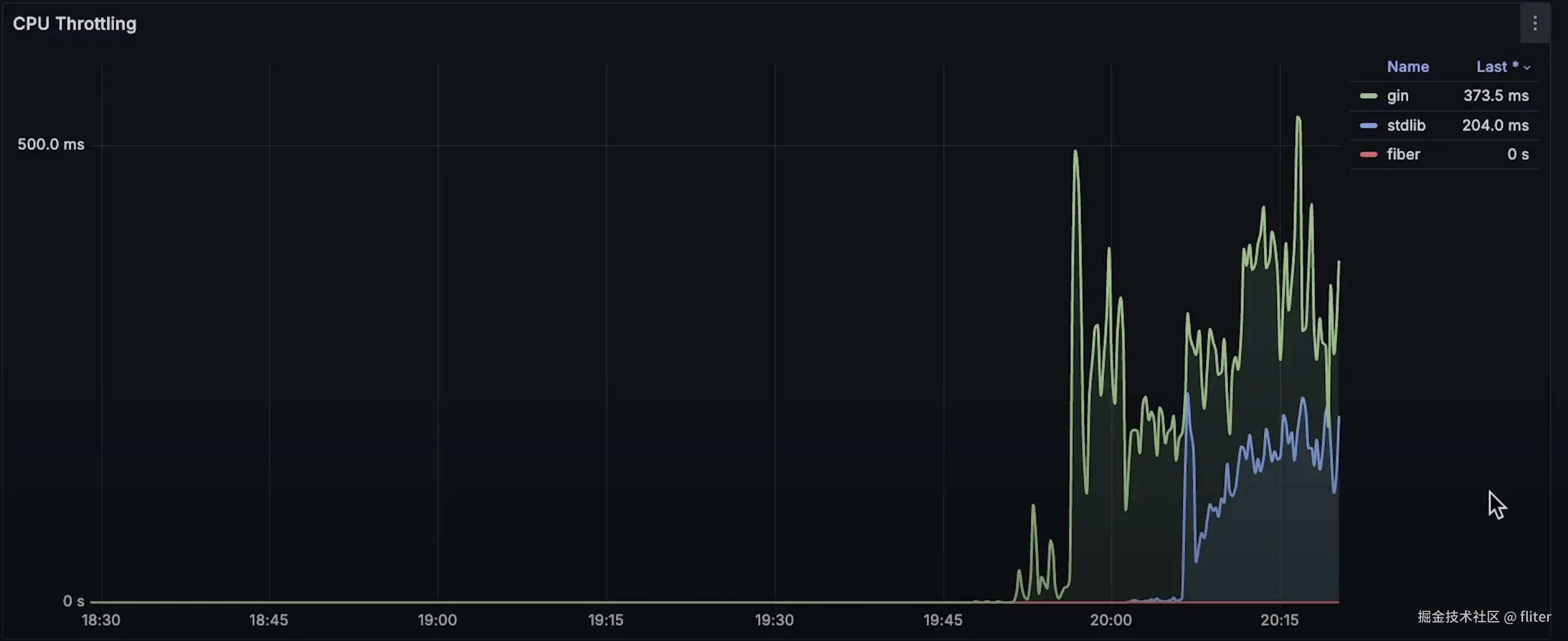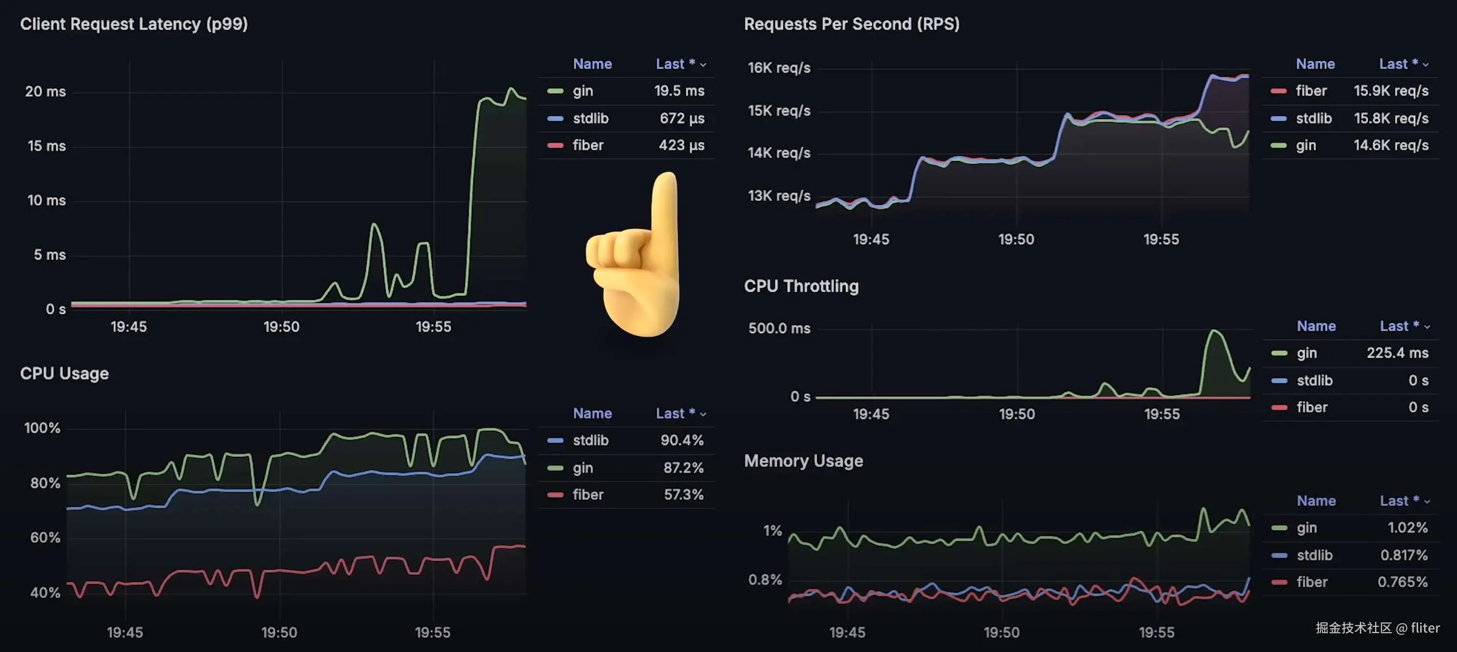 Gin 最先 达到了 Kubernetes 设定的 Pod 资源限制,导致 Kubernetes 开始对其进行调节(throttling),这直接 影响了性能,并增加了延迟。如果你在 Kubernetes 中运行 CPU 密集型应用,一定要 监控throttling的情况。