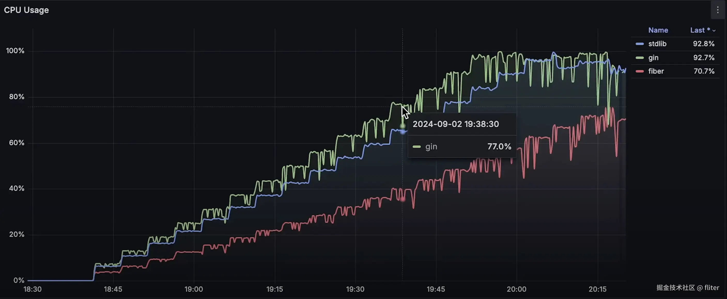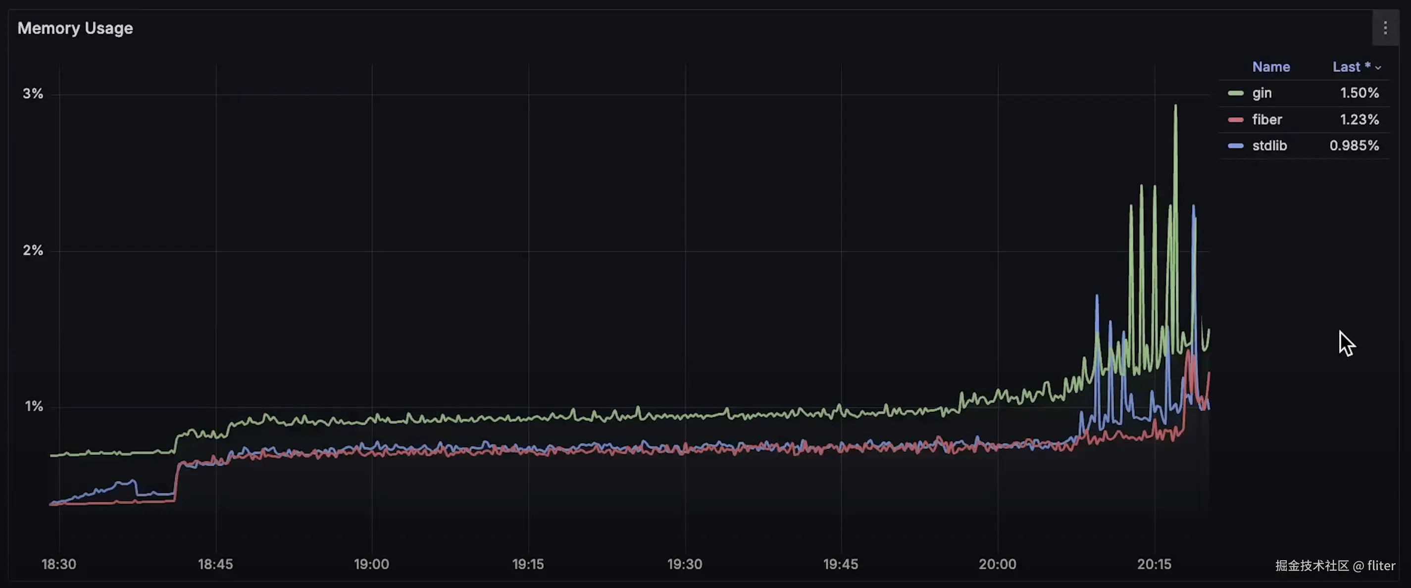 可以看到,Gin 框架 运行时的 内存和 CPU 占用略高,而 Go 标准库 的资源使用情况与 Fiber 相当接近。