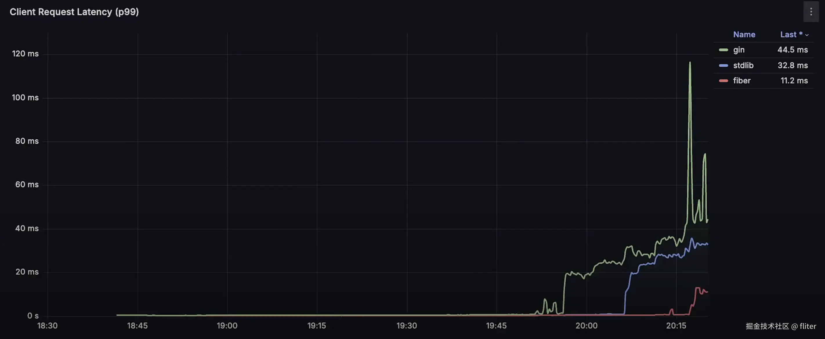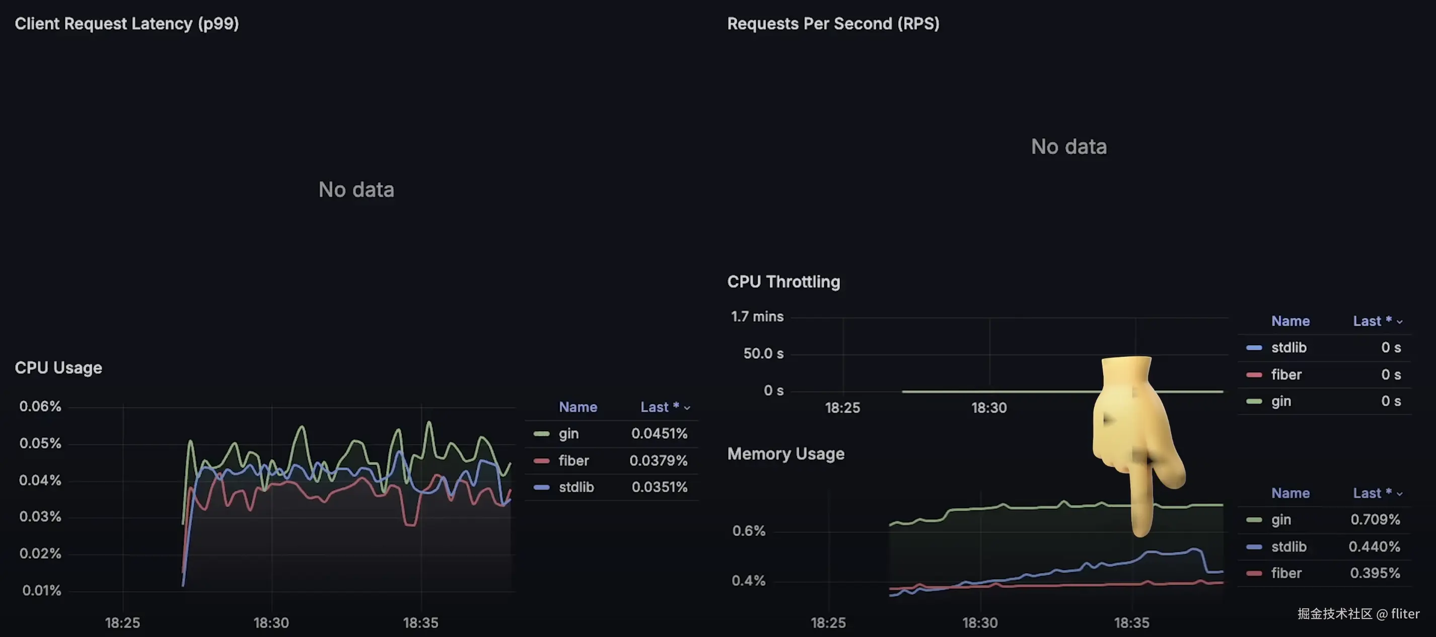 从 每秒请求数(RPS)图表 可以看到,Gin 在 2 个 CPU 和 256MB 内存的 Pod 限制 下,最多只能处理 15,000个请求。