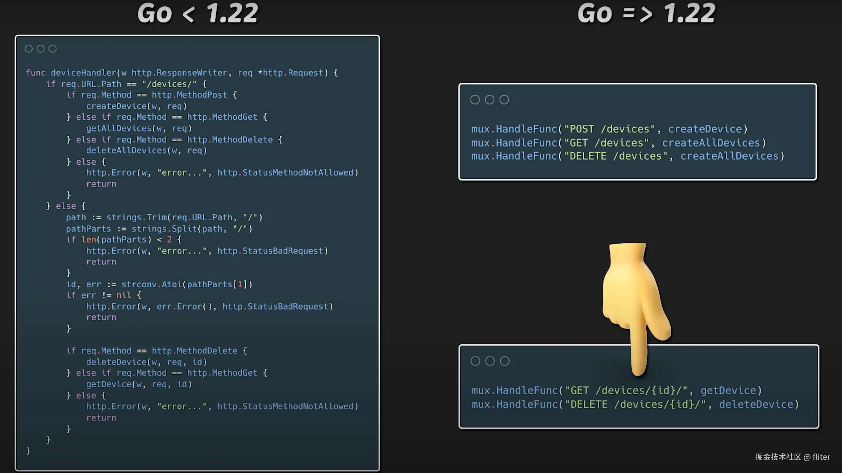 在 Go 1.22 版本之前,仅使用 Go 标准库 来开发 REST API 是一项十分困难的任务。其主要原因之一是:标准库中的 HTTP 请求多路复用器(multiplexer)不支持将 URI 模式映射到 HTTP 方法,而这对于设计 RESTful 资源至关重要。因此,许多开发者最终选择了使用诸如 Gin 或 Fiber 之类的 第三方路由库。 (还有如Gorilla Mux,Chi)
