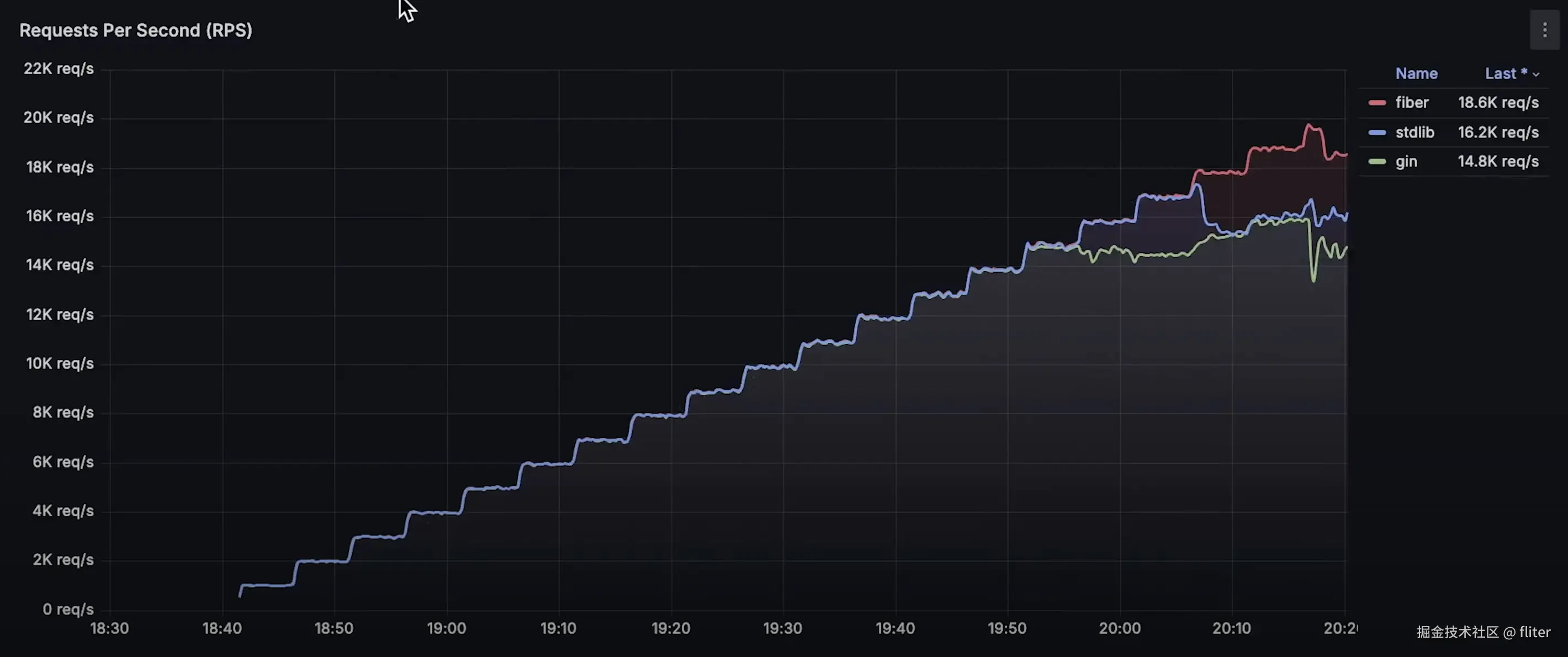 - 最后,Fiber 也达到了极限,在约 20,000 RPS 时 开始退化。
