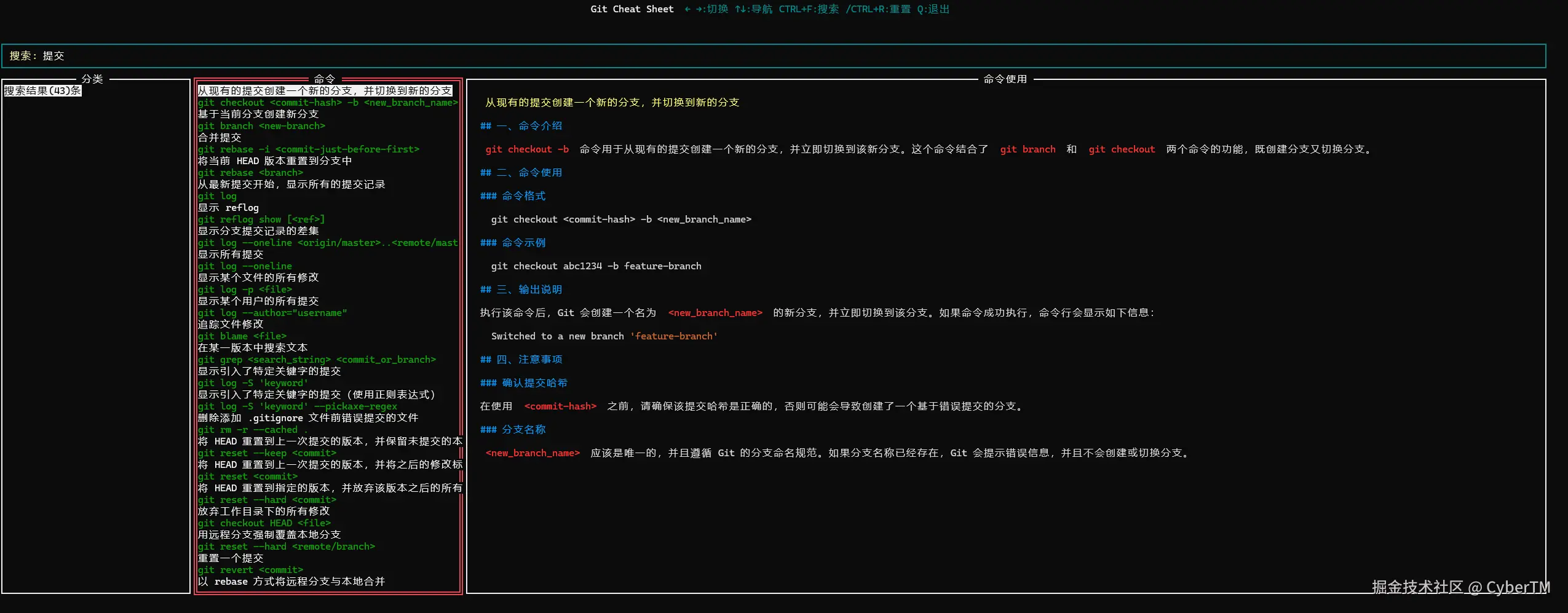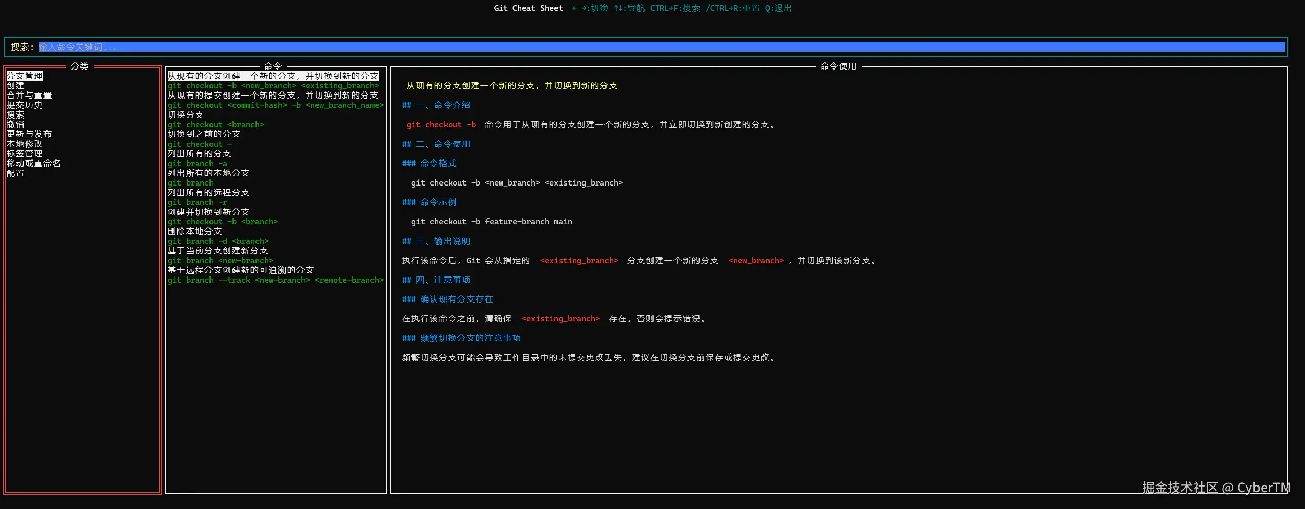 在日常开发中,Git 是版本控制的利器,但其命令繁多、参数组合复杂,常常让人头疼。为了解决这些问题,我开源了一款终端 Git 速查工具 —— Git Cheat Sheet TUI。它不仅能帮助你快速查找和掌握 Git 命令,还能通过终端用户界面(TUI)提供流畅的操作体验。