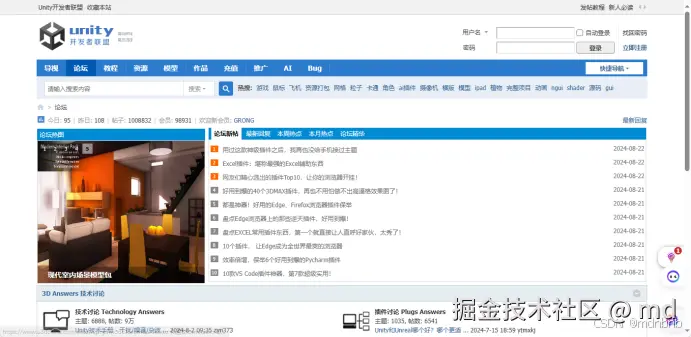 Unity3D开发者论坛是一个专注于Unity引擎的开发者社区。在这个论坛上,开发者们可以分享自己的项目经验、技术问题以及解决方案。该论坛覆盖了Unity中的各种主题,包括脚本编写、资产管理、物理引擎、图形渲染等。社区成员积极参与讨论,帮助新手解答疑问,同时也分享高质量的教程和资源。