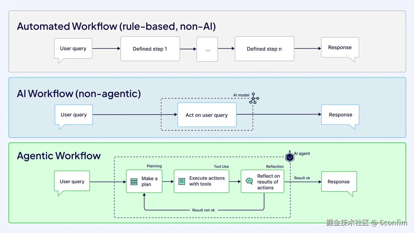如你所见,我们需要区分三种类型的工作流:传统的非AI工作流、非智能代理AI工作流和智能代理工作流。传统的基于规则的工作流和AI工作流之间的区别在于使用预定义步骤与使用AI模型来完成任务。其次,非智能代理和智能代理AI工作流之间的区别在于使用静态AI模型与动态AI智能代理。这使得智能代理工作流比非智能代理工作流更具适应性和动态性。