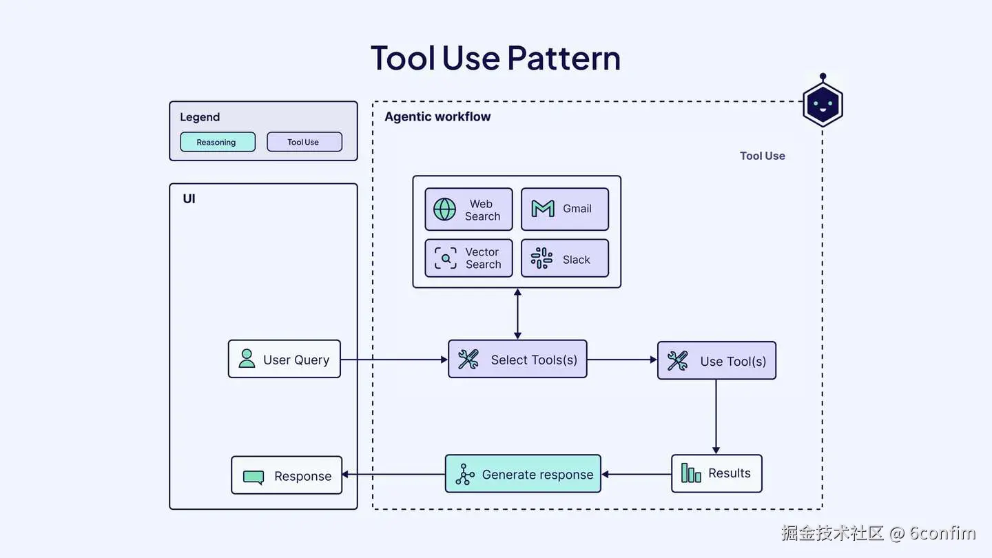 然而,工具使用超越了简单的RAG,它允许LLM与现实世界_动态交互_,而不是仅仅从中检索数据。在智能代理工作流中,工具使用模式通过允许智能代理与外部资源和应用程序、实时数据或其他计算资源交互来扩展其能力。