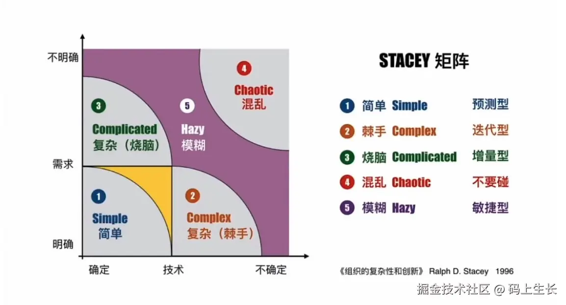 以上就是常用的开发模式,但是我们在实际应用中,应该怎么选择哪一种开发模式呢?为此有一个STACEY矩阵图可以作一些参考,如下所示: