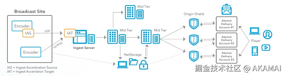 接下来,我们需要在Akamai网络上设置Ingest Acceleration Target(IAT),并确保IAT配置为将数据流解码为原始格式。然后将IAT连接到Akamai的入口点软件,从而进行进一步处理。在编码和摄取阶段,很多人会遇到丢包问题。实时视频流对丢包非常敏感,丢包会降低视频流的质量,导致播放过程频繁缓冲,进而降低观看体验。但是使用Akamai平台进行直播流媒体的客户不会遇到这种情况,因为Akamai使用了基于UDP的加速技术,能够确保数据包更可靠、更快速地分发,即便在不稳定的网络条件下也能缓解丢包的影响。这项技术在直播流媒体过程中至关重要的另一个原因是:基于TCP的传统传输方式会因为拥塞控制和纠错机制而产生高延迟。直播流媒体要求低延迟,以保证观众能实时接收内容。Akamai基于UDP的加速可通过最大限度减少这些开销,提供更高吞吐量和更低延迟,这对于及时分发直播内容至关重要。