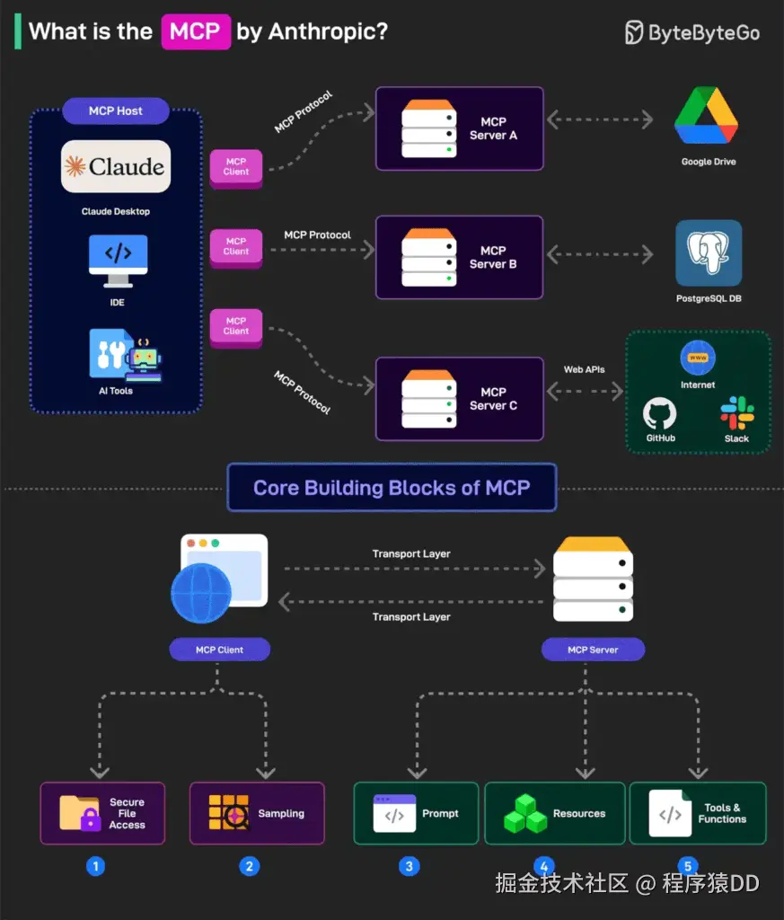 关于MCP的架构,这里可以看看ByteByteGo的这张架构图: