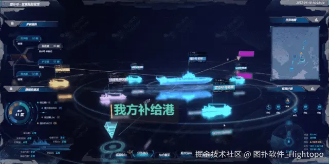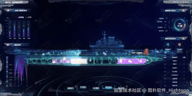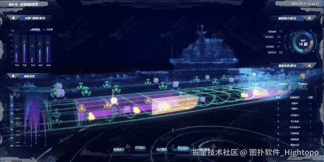 以军舰数字孪生虚拟仿真为例,通过图扑 HT 技术,海军能够在虚拟场景中开展各类复杂的战术演练。模拟不同舰艇编队在复杂海况和作战环境下的协同作战能力,提升作战指挥的准确性和高效性。